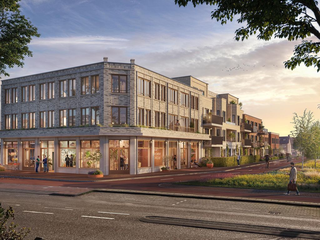 Het gebouw is opgetrokken uit warm baksteen, afgewisseld met lichte tinten en gevelschilderwerk, waardoor het perfect passen in het straatbeeld van de omgeving. De begane grond geeft net wat extra aandacht aan de hoogte. De hoge plint van het gebouw zorgt niet alleen voor een krachtige uitstraling, maar ook voor een levendig straatbeeld. Denk aan grote ramen, fijne zichtlijnen en ruimte voor functies die de buurt doen bruisen: een atelier met open deuren of een yogastudio.