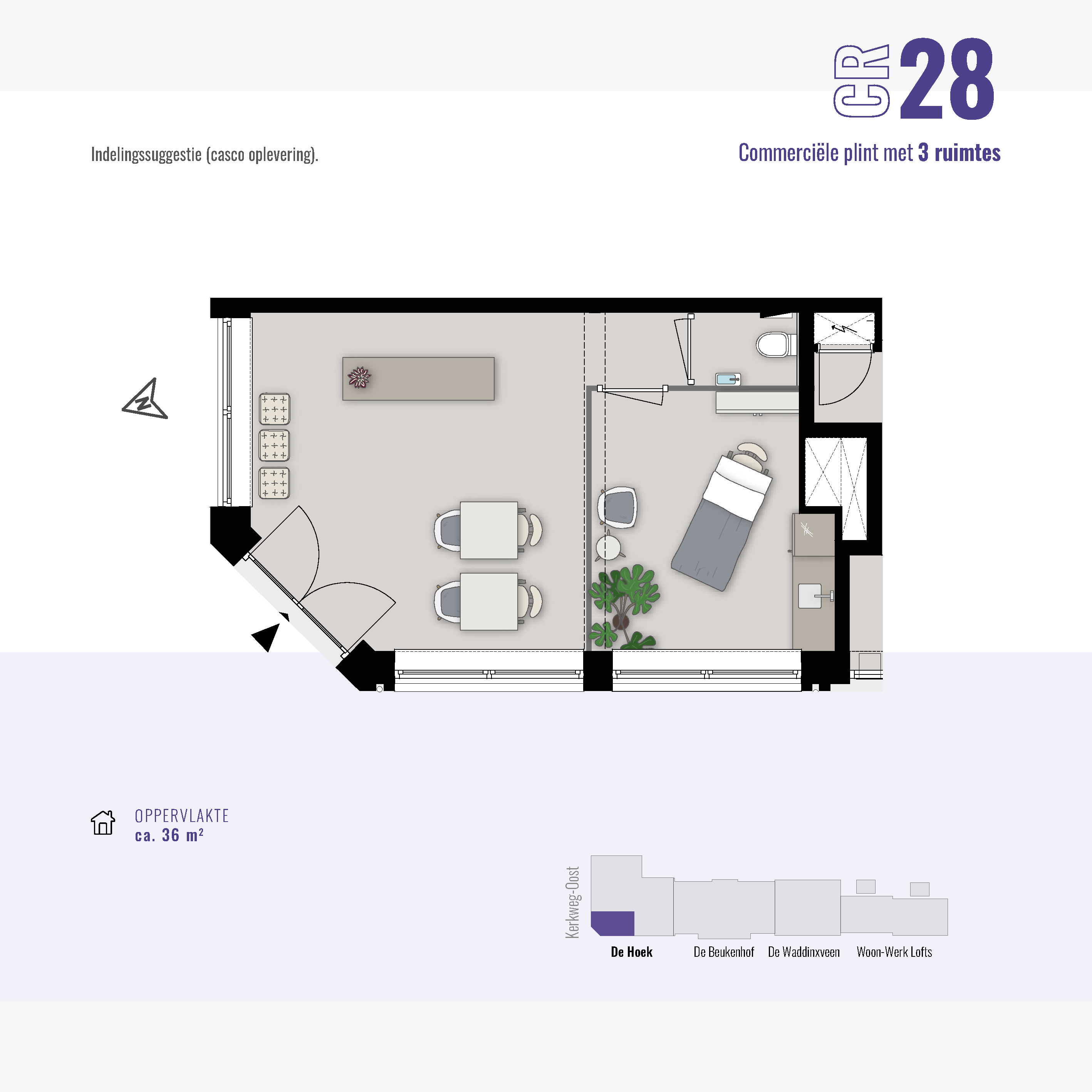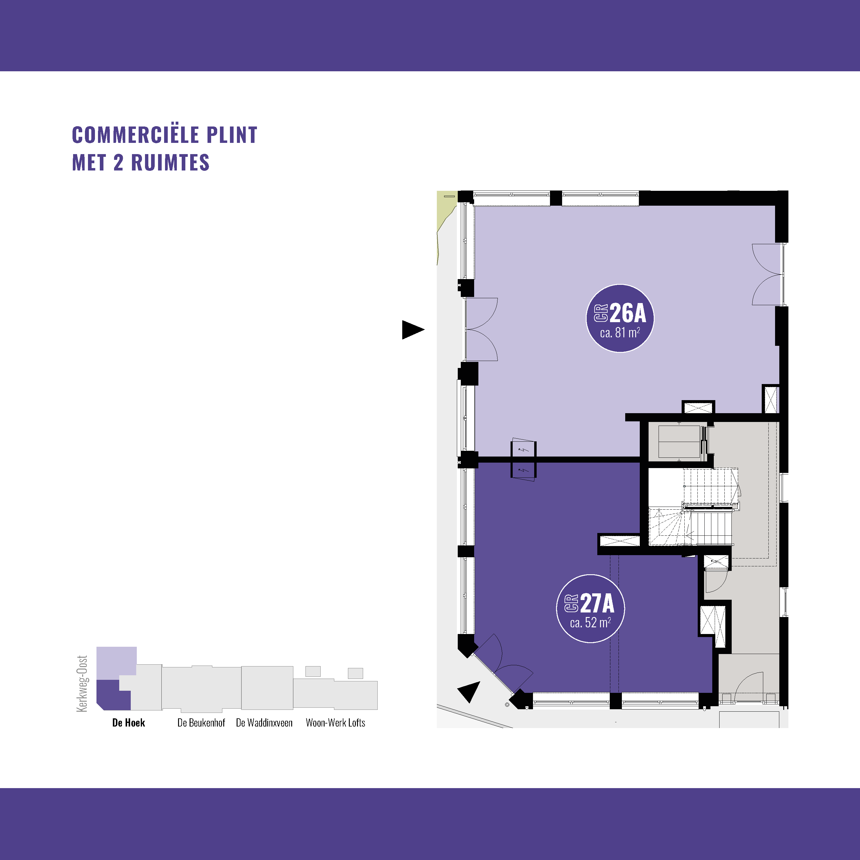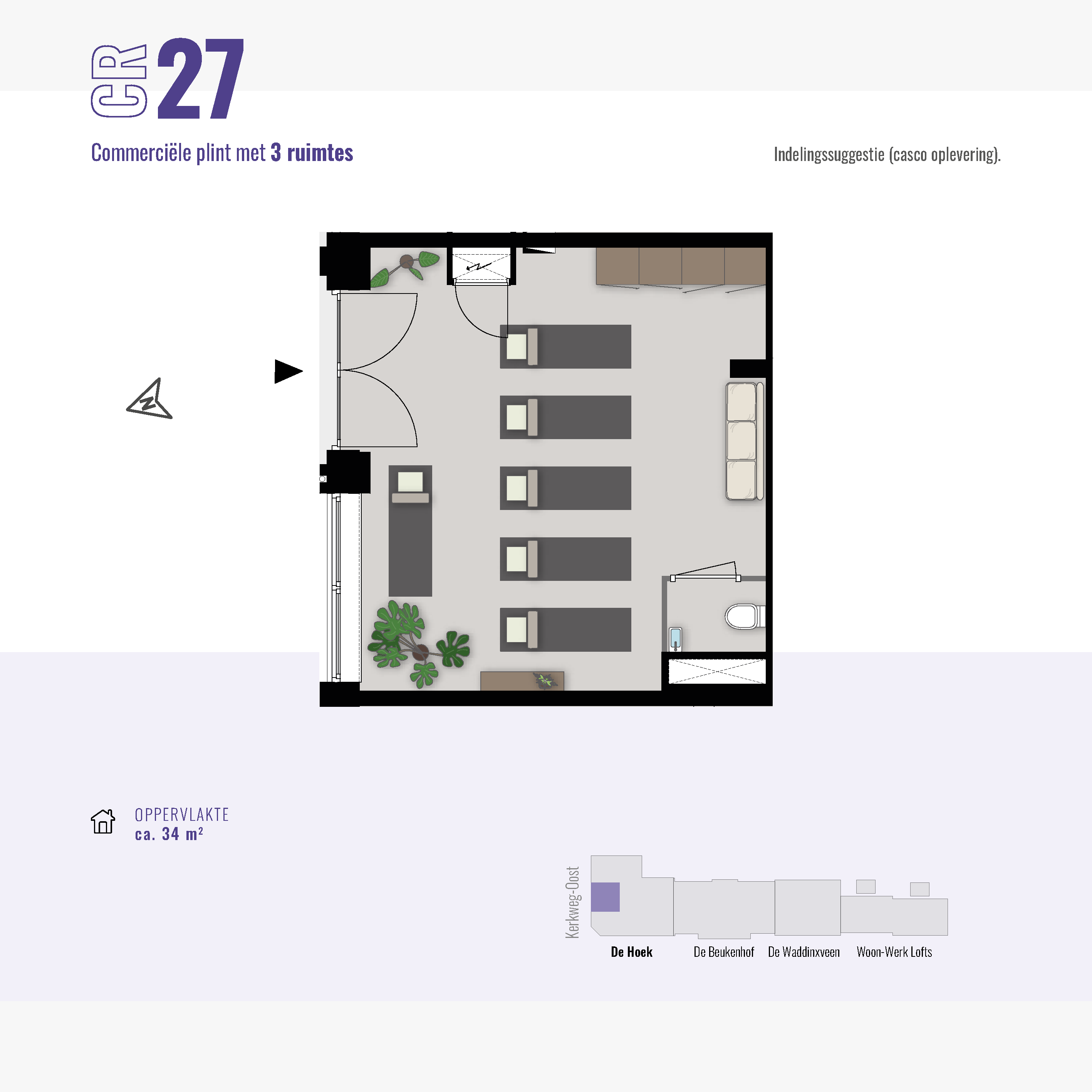 De commerciële ruimte(s) beginnen al bij 34 m2. Hier kun je klein beginnen of groter groeien. In totaal is de gehele commerciële plint 133 m² en flexibel indeelbaar voor één of maximaal drie ondernemers. De ruimte(s) worden te koop aangeboden, zodat jij een duurzame investering kunt doen in jouw eigen plek.