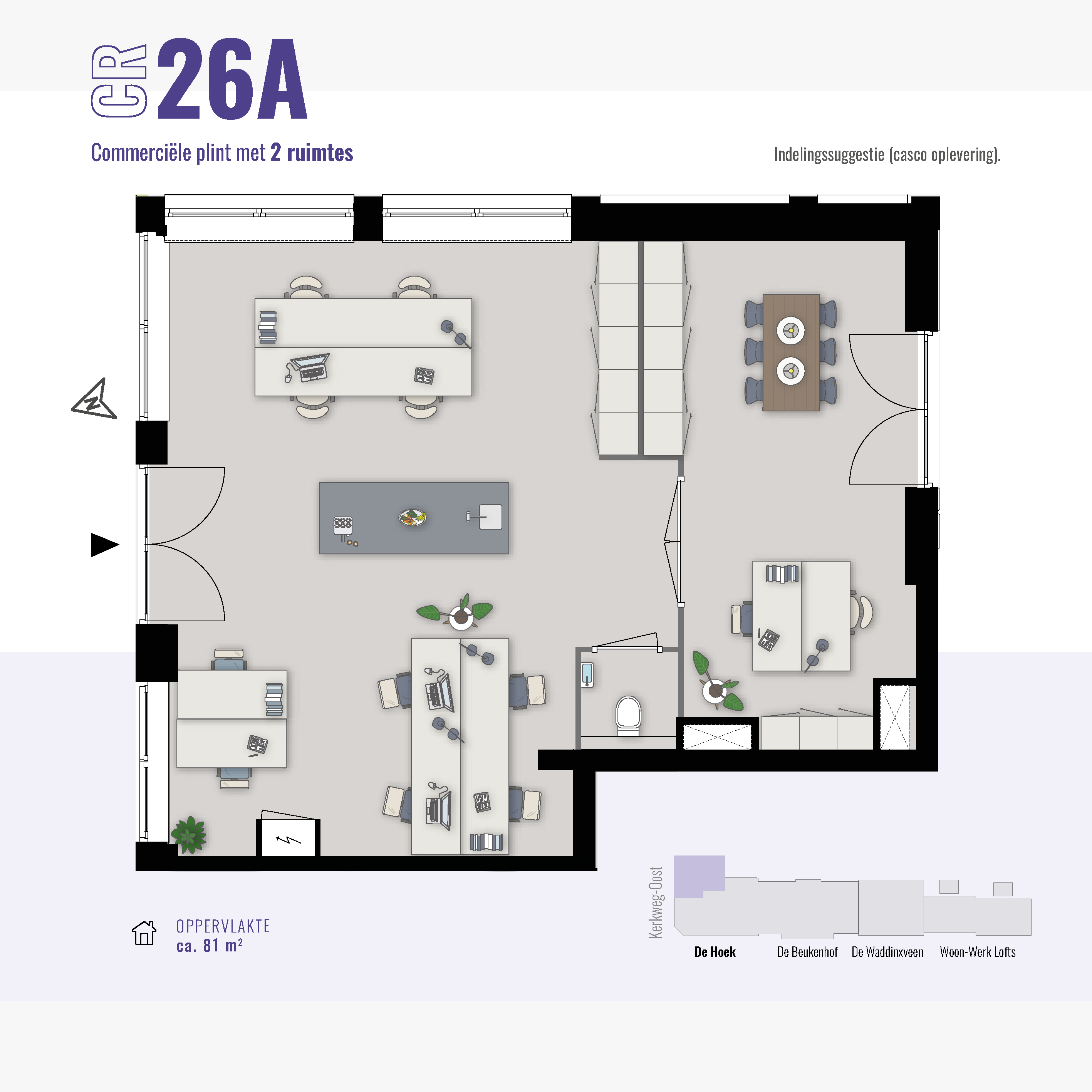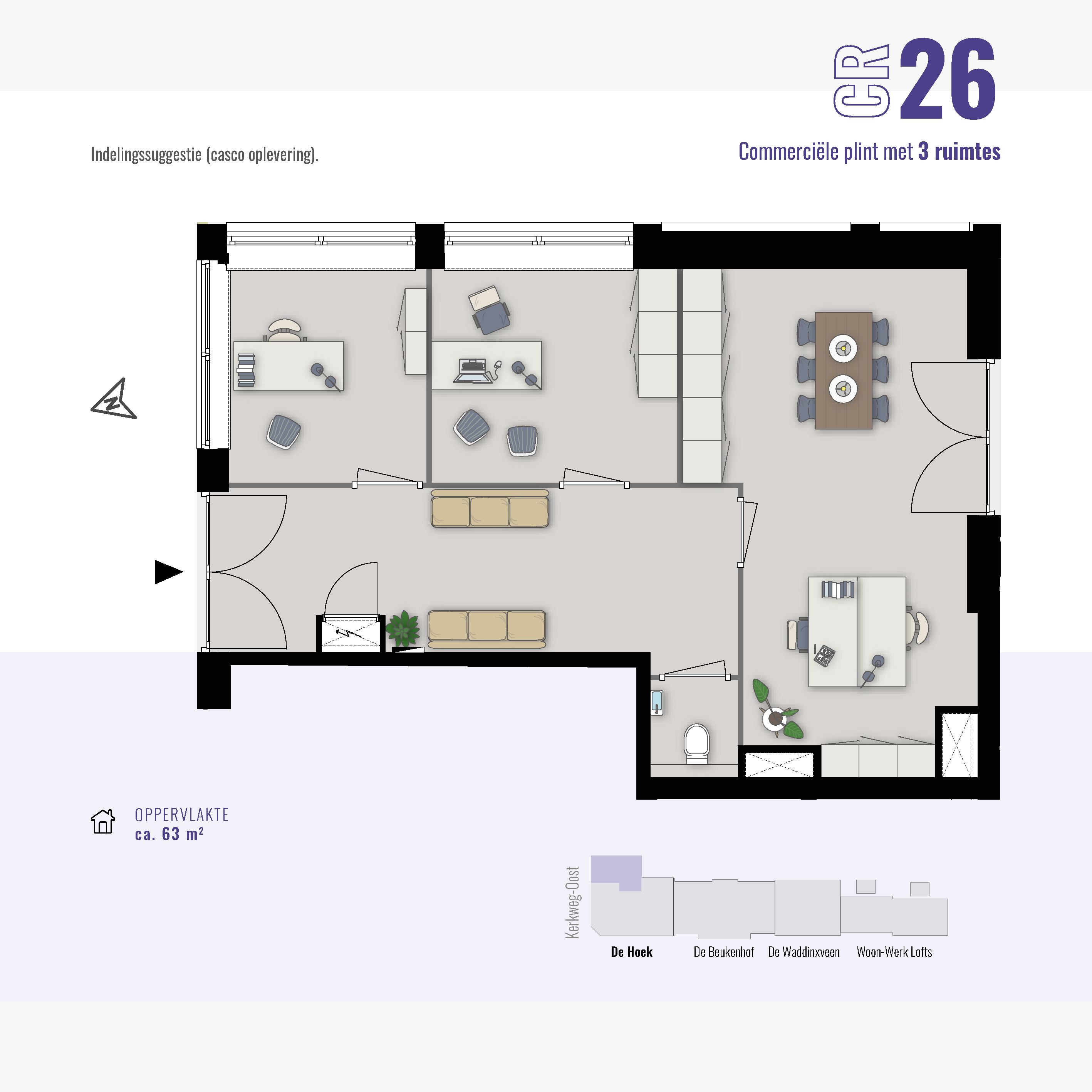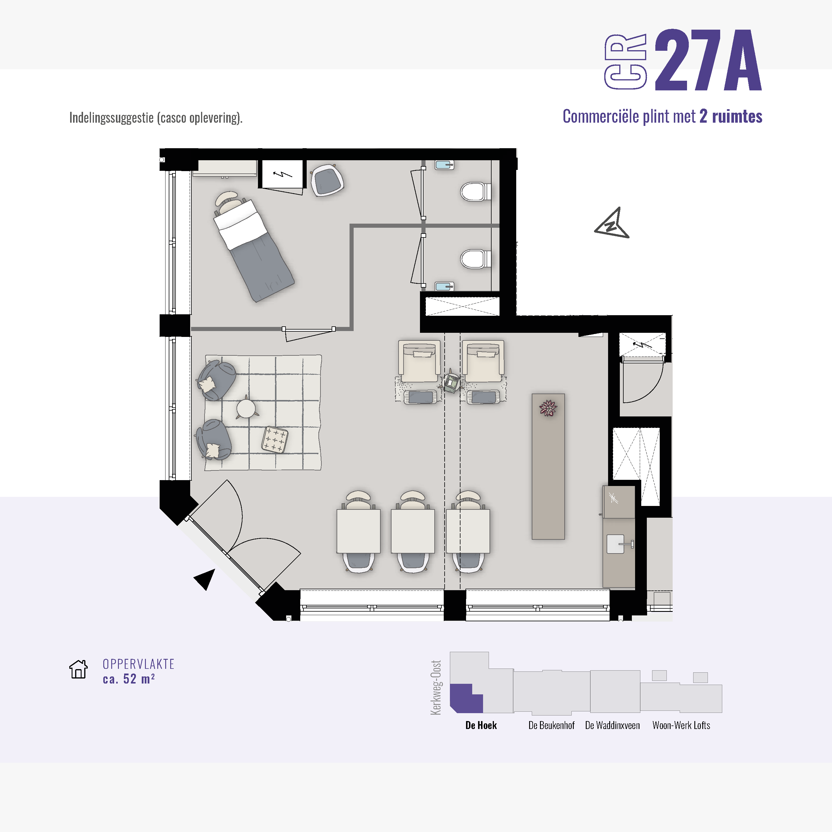 De commerciële ruimte(s) beginnen al bij 34 m2. Hier kun je klein beginnen of groter groeien. In totaal is de gehele commerciële plint 133 m² en flexibel indeelbaar voor één of maximaal drie ondernemers. De ruimte(s) worden te koop aangeboden, zodat jij een duurzame investering kunt doen in jouw eigen plek.