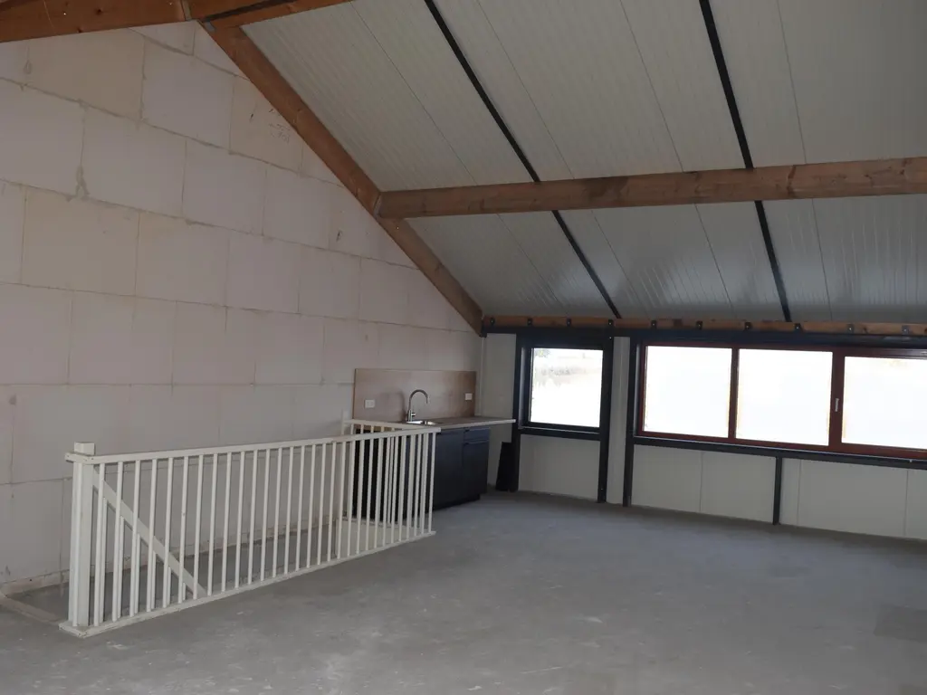 Trapopgang naar een open ruimte van ca. 55 m² met een nokhoogte van ca. 4,4 m. Voorzien van een toilet met fontein, een keukenblok met close-in boiler en verlichtingsarmaturen.