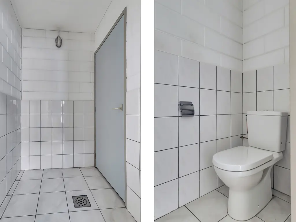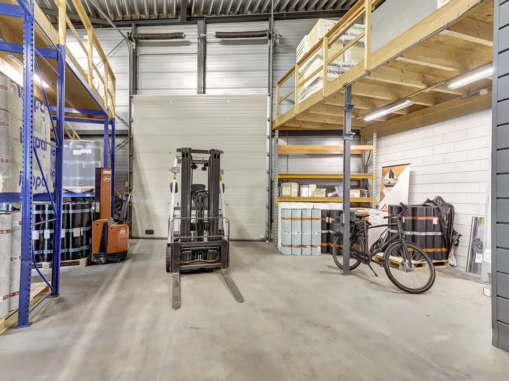Verder op de begane grond de hal met toegang tot de verdieping, toiletruimte en een afgesloten magazijnruimte van ca. 62m². Ook deze ruimtes zijn praktisch en robuust afgewerkt. De aanwezige overheaddeuren en loopdeuren zorgen voor een efficiënte goederenstroom en optimale toegankelijkheid voor uw bedrijfsvoering.