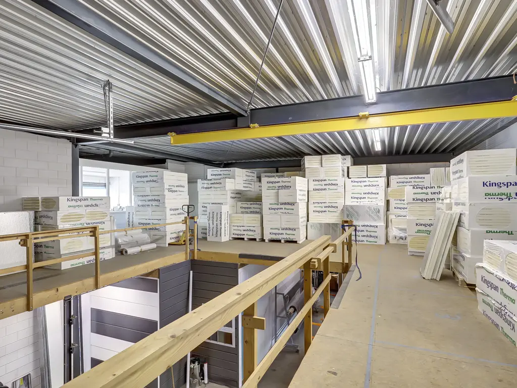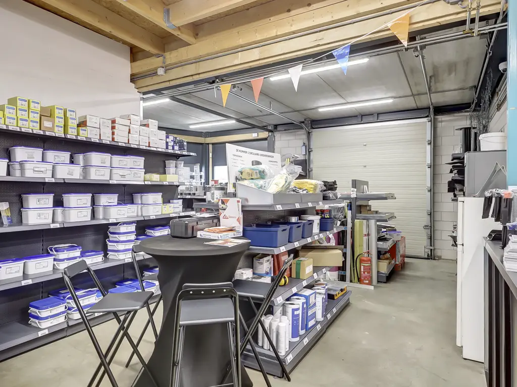 De eerste verdieping biedt extra ruimte en flexibiliteit met meerdere magazijnruimtes met een totaal oppervlak van ca. 270m², ideaal voor aanvullende opslag of ondersteunende werkzaamheden. Deze verdieping is deels open, waardoor er een visuele en functionele verbinding bestaat met de onderliggende werkruimte. De magazijnruimtes zijn voorzien van een degelijk afgewerkte vloer en strakke wanden, wat bijdraagt aan een nette en functionele uitstraling.