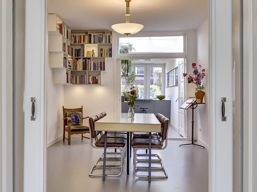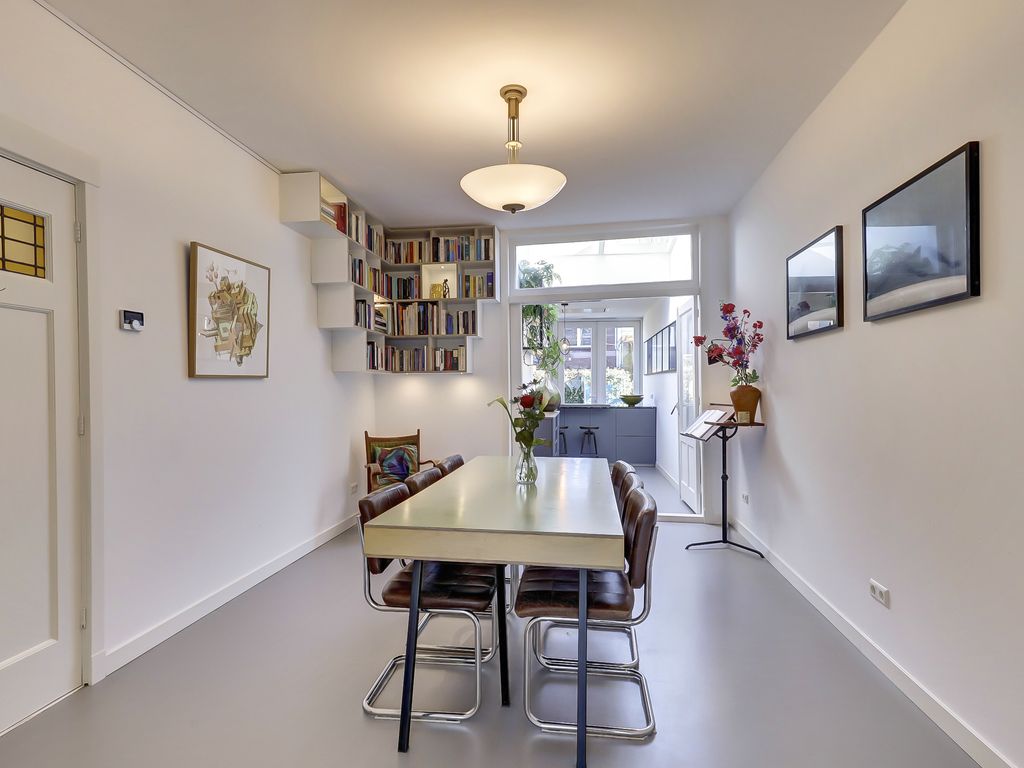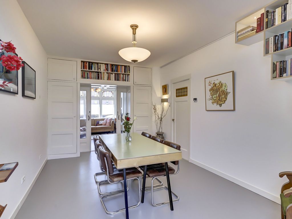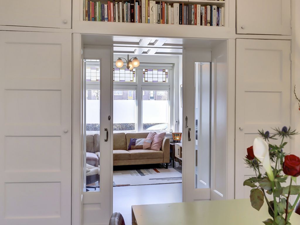 Aan de voorzijde ligt de sfeervolle woonkamer met erker en glas-in-loodramen. Aansluitend bevindt zich de eetkamer, die middels klassieke en suite deuren met vaste kasten is verbonden met de woonkamer. De ruimtes zijn afgewerkt met een marmoleum vloer met comfortabele vloerverwarming.