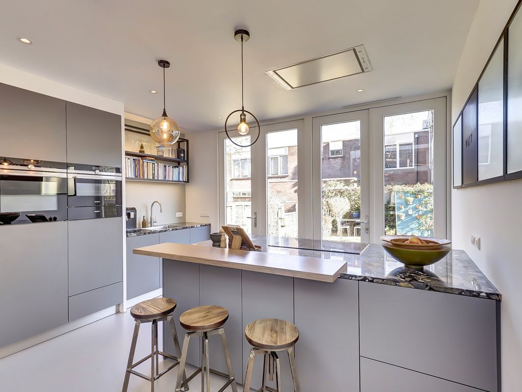 De keuken biedt middels twee dubbele openslaande deuren toegang tot de achtertuin, waardoor je als de deuren op een zonnige dag open staan bijna in de tuin staat te koken.