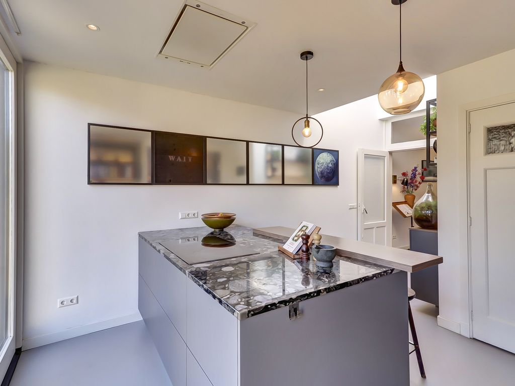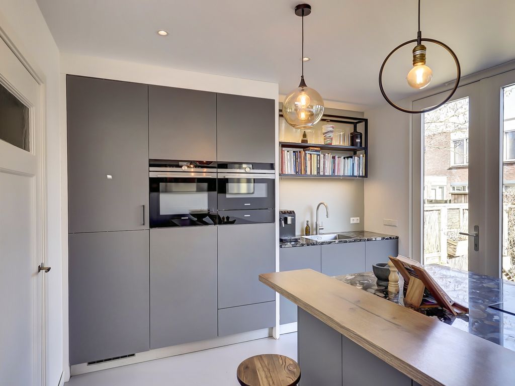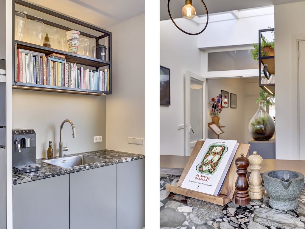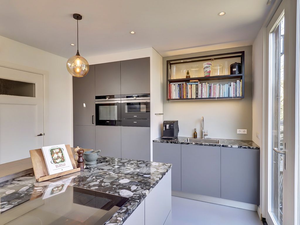Aan de achterzijde van de woning bevindt zich de royale woonkeuken met kookeiland. De keuken is modern ingericht en voorzien van diverse inbouwapparatuur, waaronder een inductiekookplaat, plafondafzuigkap, vaatwasser, Quooker, warmhoudlade, combi-stoomoven, heteluchtoven en koelkast. Dankzij de lichtkoepel en de openslaande deuren naar de tuin is dit een heerlijk lichte leefruimte. Tevens is er een kelder (ca 5m², sta-hoogte 1.80m.), met toegang vanuit de keuken aanwezig