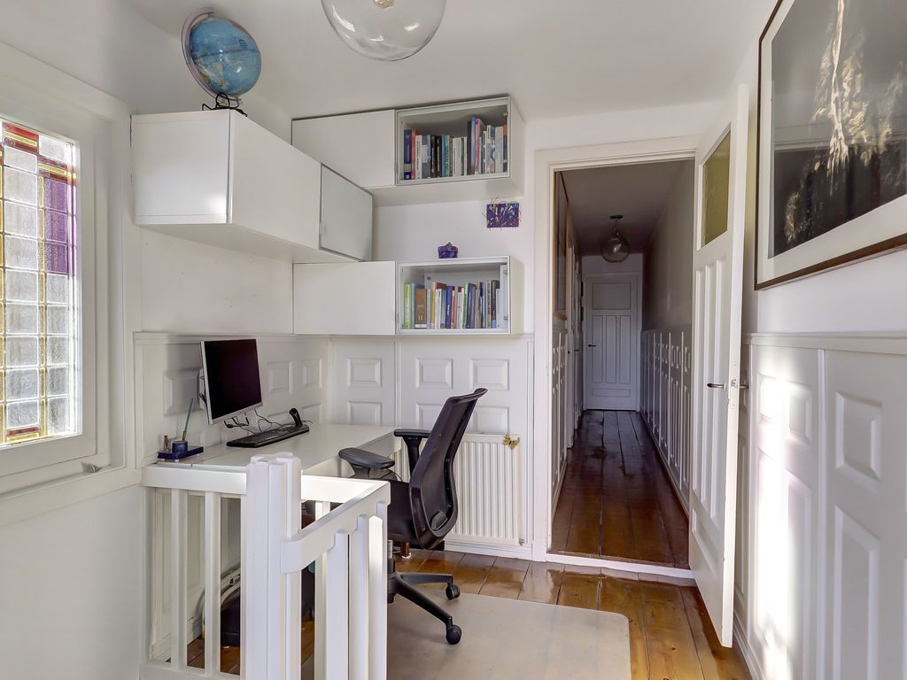 De overloop biedt ruimte voor een werkplek en geeft tevens toegang tot een separaat toilet en het platte dak.