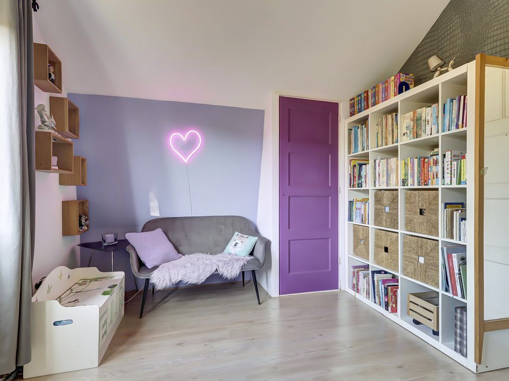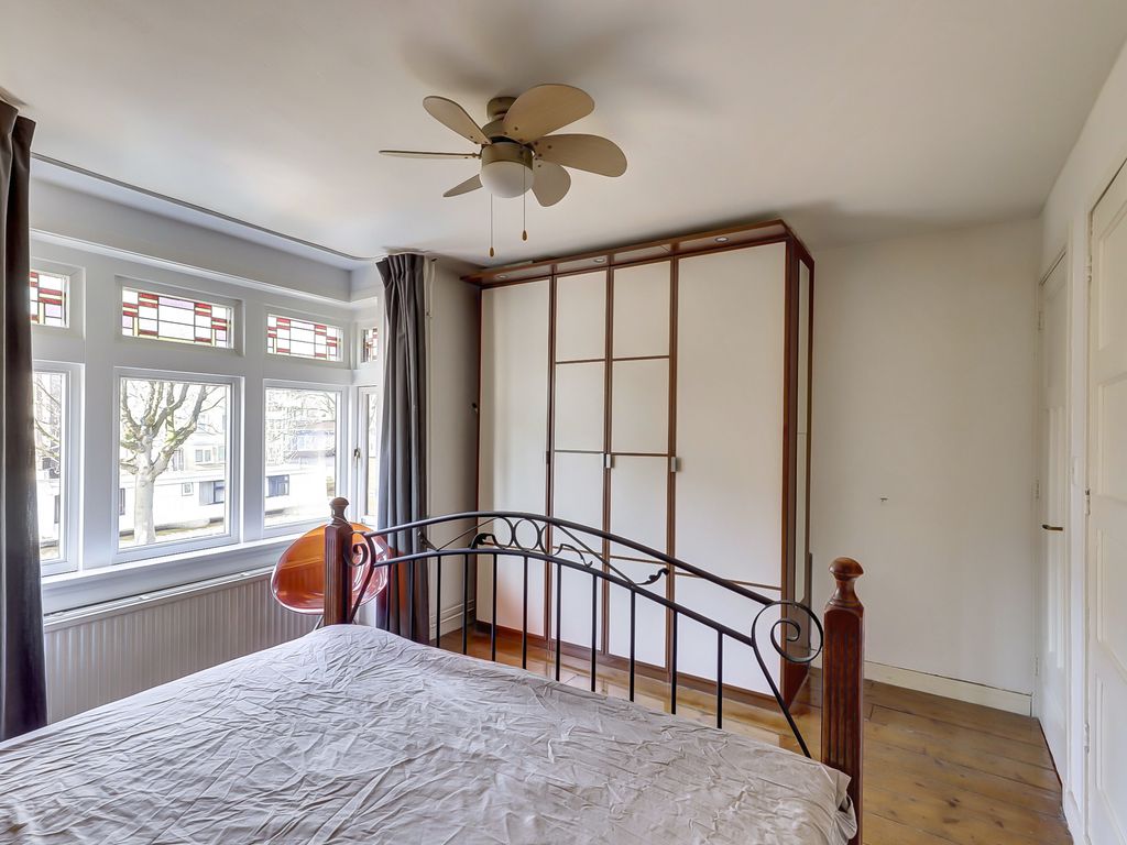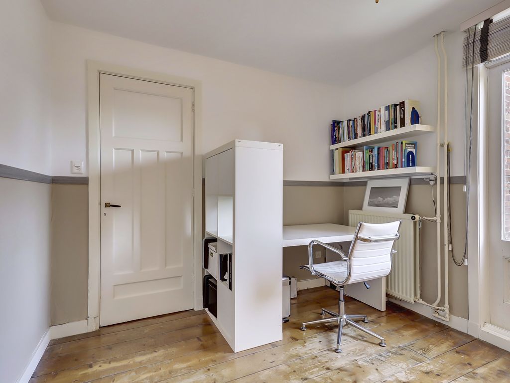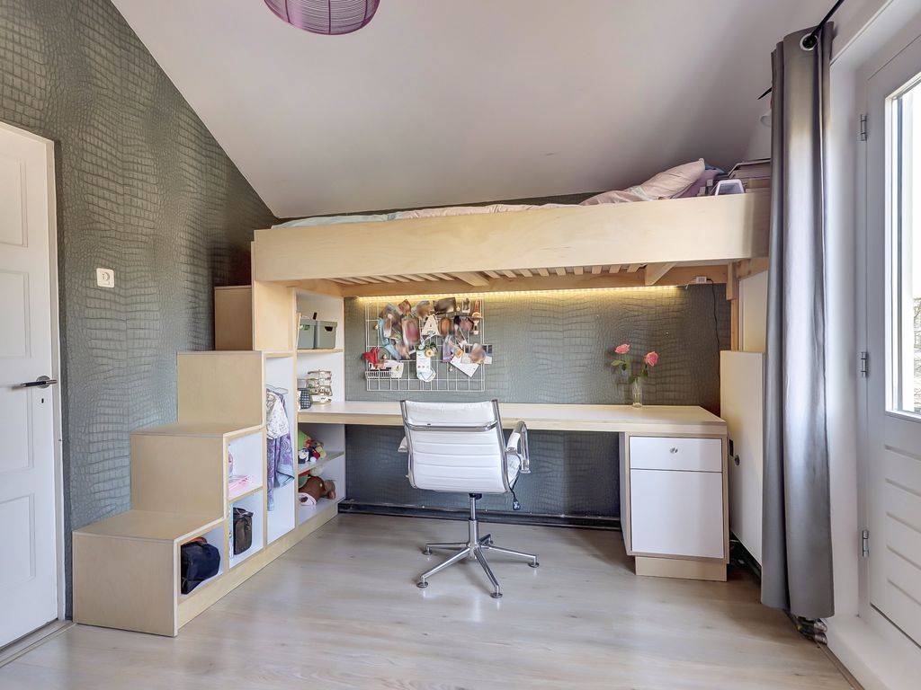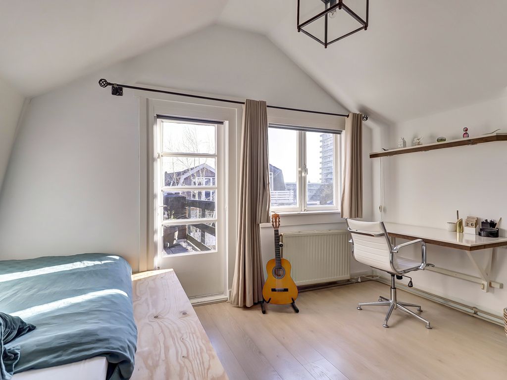 Aan de voorzijde ligt de tweede slaapkamer met karakteristieke erker en vaste kasten.