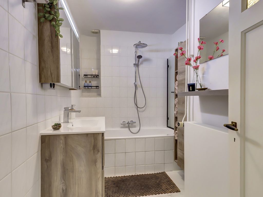 De badkamer is centraal gelegen en voorzien van een wastafelmeubel en een ligbad met douche.