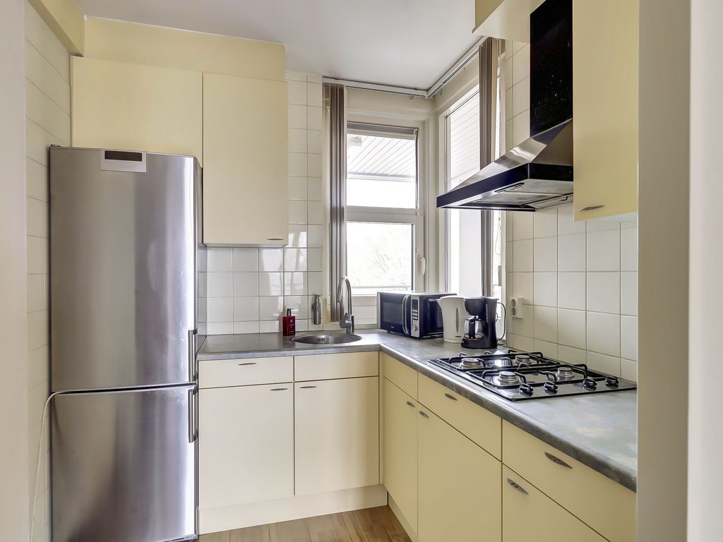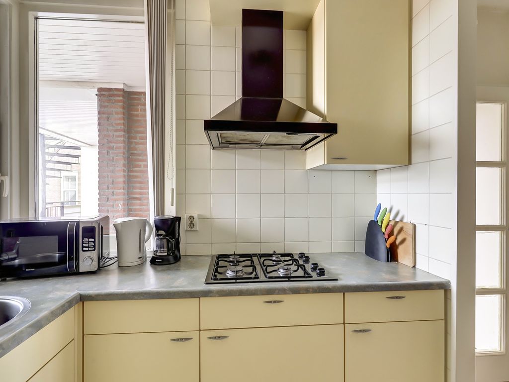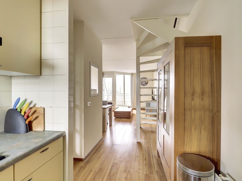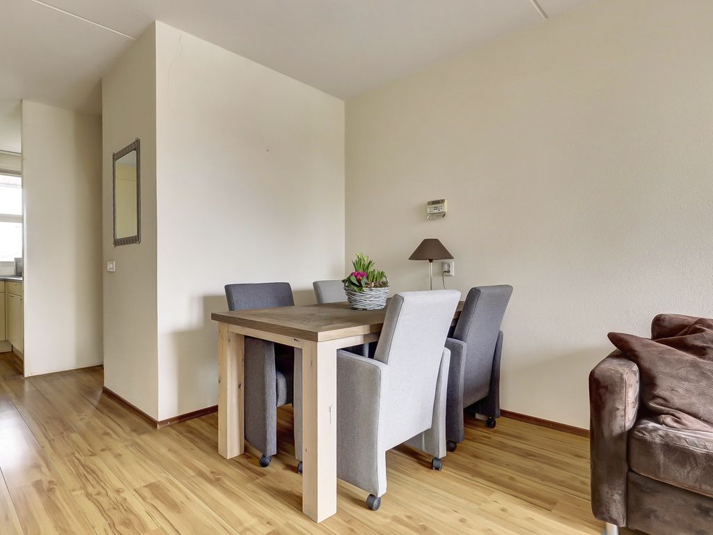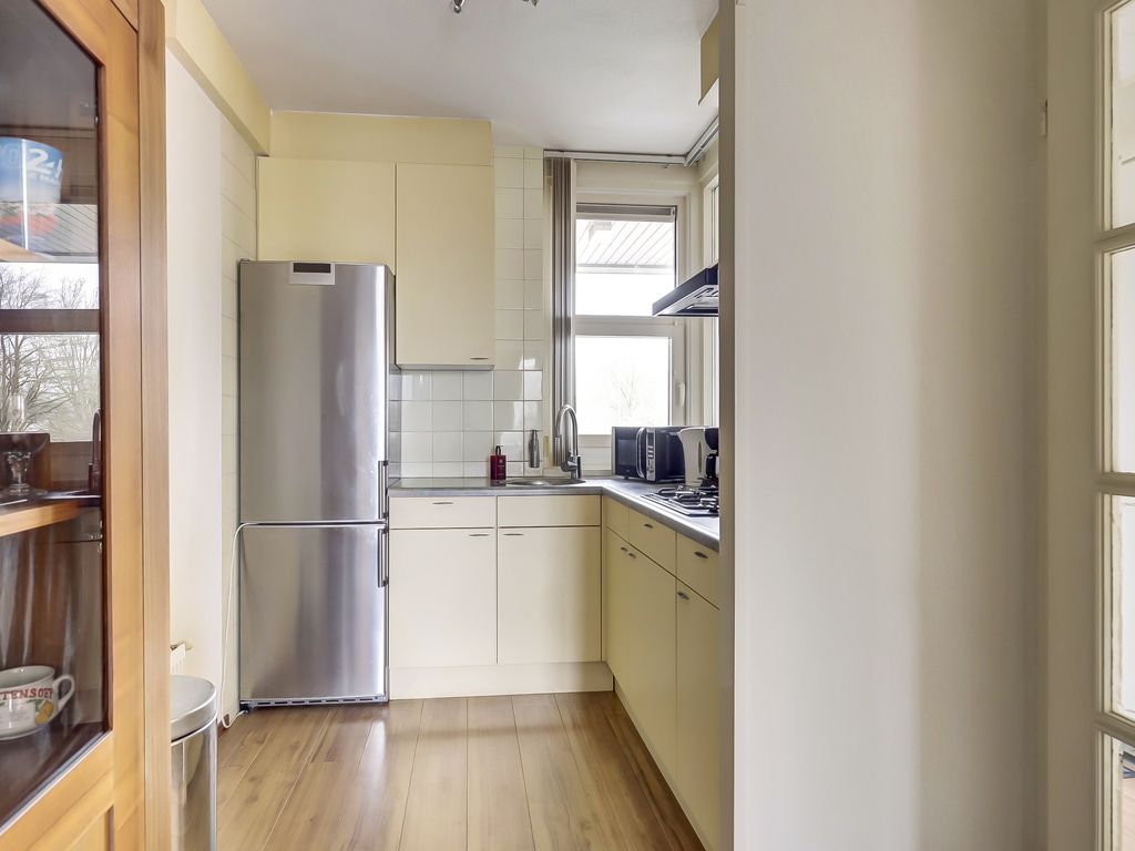De lichte woonkamer van ca. 23m² is voorzien van een laminaatvloer en biedt toegang tot het balkon, waar je heerlijk buiten kunt zitten. De open keuken van ca. 5m² sluit aan op de woonkamer en is uitgerust met een koel-/vriescombinatie, 4-pits gaskookplaat en afzuigkap. Een praktische en overzichtelijke indeling zorgt voor optimaal gebruik van de ruimte.