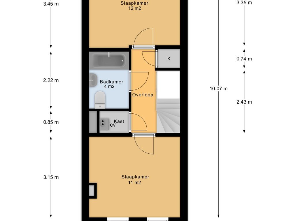 Slaapkamer 1 is ca. 11m² en slaapkamer 2 is ca. 12m².