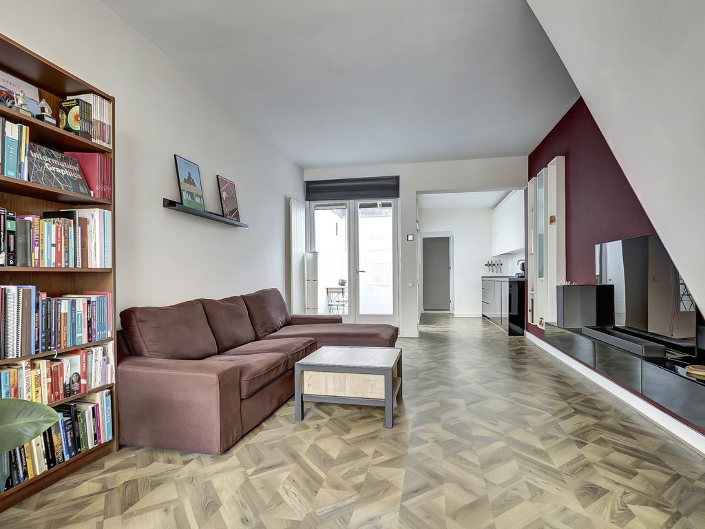 De sfeervolle en lichte woonkamer (ca. 29 m²) bevindt zich aan de voorzijde van de woning en is voorzien strak afgewerkte wanden en plafonds. Dankzij de openslaande deuren is er een prettige verbinding met de patio, wat zorgt voor extra lichtinval en een ruimtelijk gevoel.
