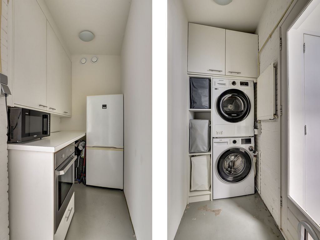 Aan de achterzijde van de woning bevindt zich de moderne halfopen keuken (ca. 6 m²). De keuken is voorzien van diverse inbouwapparatuur, waaronder een 4-pits elektrische kookplaat, afzuigkap, koelkast, vaatwasser en spoelbak. Daarnaast is er voldoende kastruimte aanwezig. Aansluitend aan de keuken bevindt zich de moderne toiletruimte en een praktische bijkeuken (ca. 4 m²) met aansluiting voor de wasapparatuur en een extra keukenblok met bergruimte en een grote elekrtische oven.