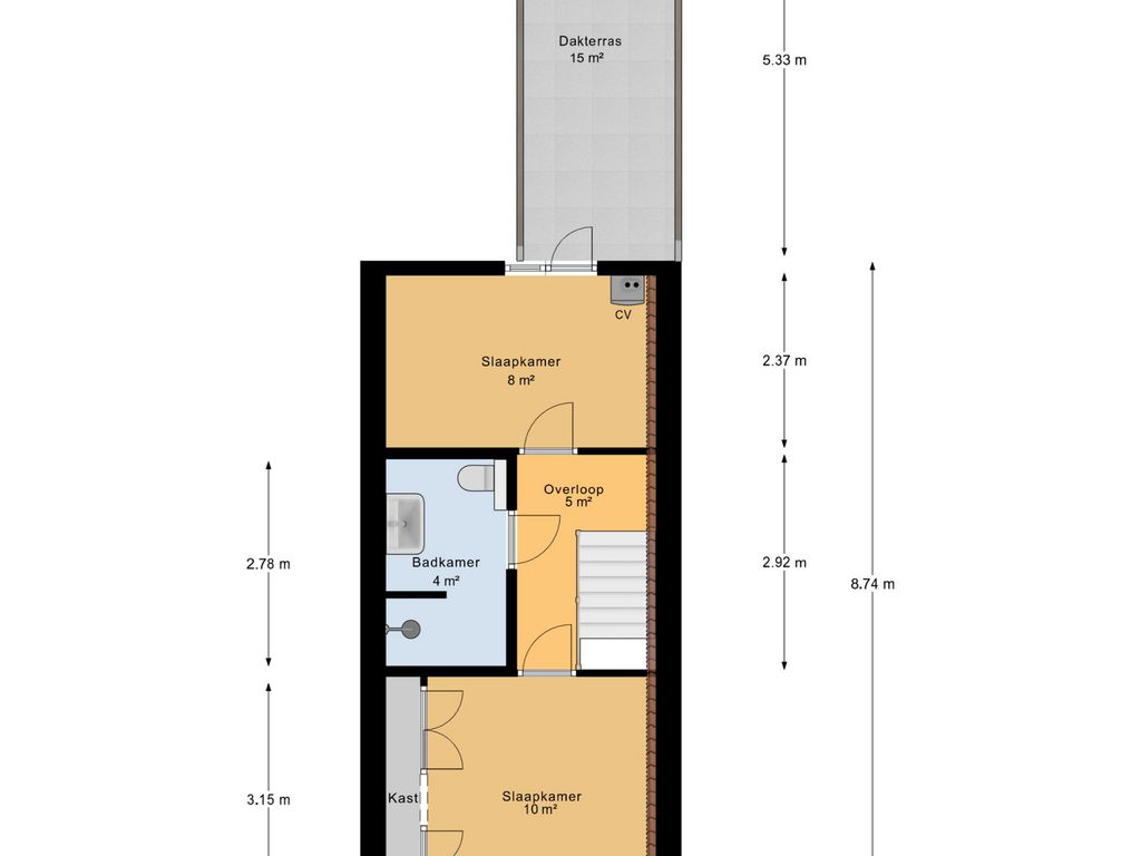 Dakterras ca. 5.33x4.07/2.24 m.