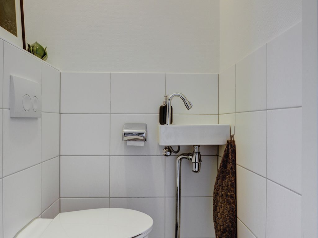 Bij binnenkomst in het appartement komt u in de hal, die toegang geeft tot de verschillende vertrekken van de woning. Vanuit hier bereikt u onder andere de separate toiletruimte, dat netjes is afgewerkt met lichte wandtegels, een wandcloset en een compacte wastafel.