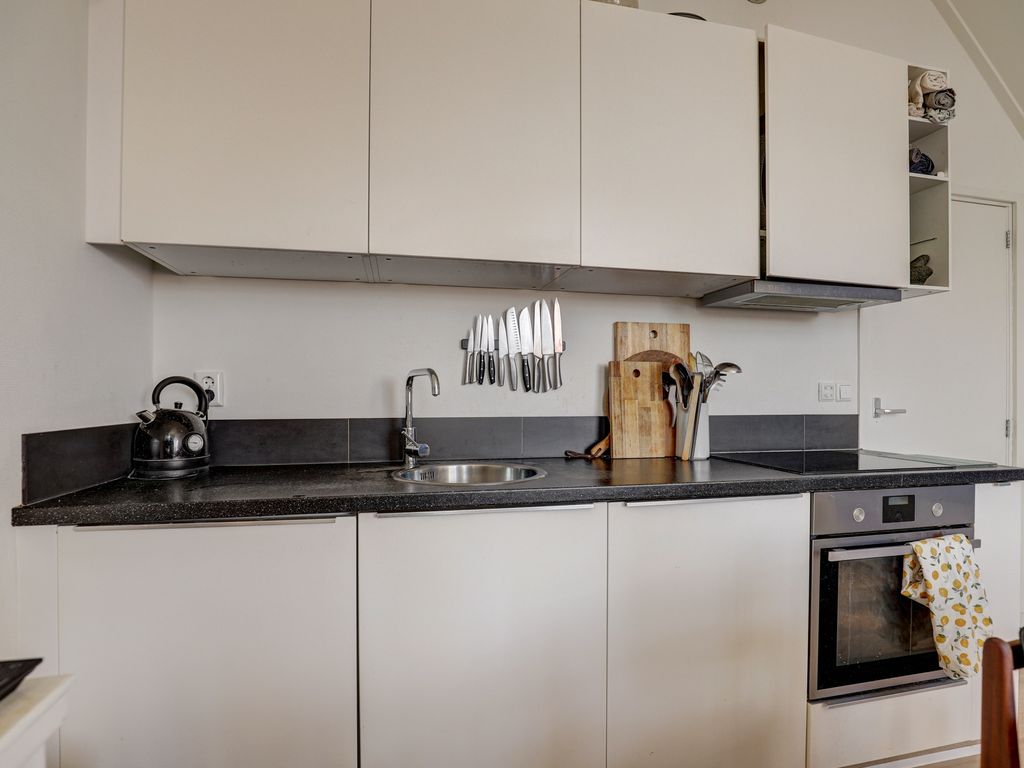 De open keukenruimte van ca. 6 m² sluit naadloos aan op de woonkamer en heeft een moderne en strakke uitstraling met witte kastfronten en een donker werkblad. De keuken is voorzien van diverse inbouwapparatuur, waaronder een oven, inductiekookplaat, afzuigkap, vaatwasser, koelkast en een spoelbak.