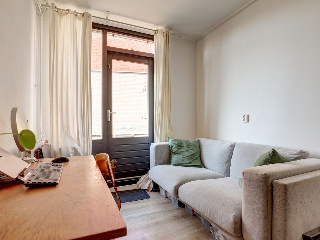 De knusse woonkamer van ca. 15 m² vormt het hart van de woning en valt direct op door de hoge plafonds en de grote raampartijen. Hierdoor ontstaat een lichte en ruimtelijke sfeer. De woonkamer biedt voldoende plaats voor een comfortabele zithoek en een eethoek. De grote ramen geven een prettig uitzicht naar buiten en laten veel daglicht binnen.