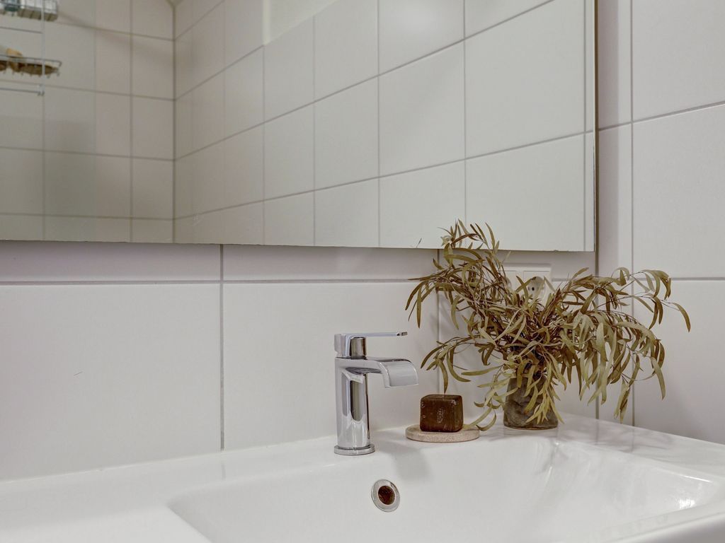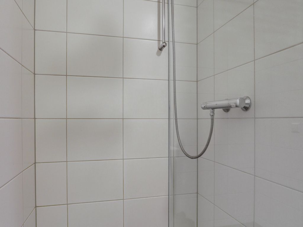 De moderne badkamer is verzorgd uitgevoerd en voorzien van een inloopdouche, een wastafelmeubel met spiegel en een handdoekradiator. De lichte betegeling zorgt voor een frisse en tijdloze uitstraling.