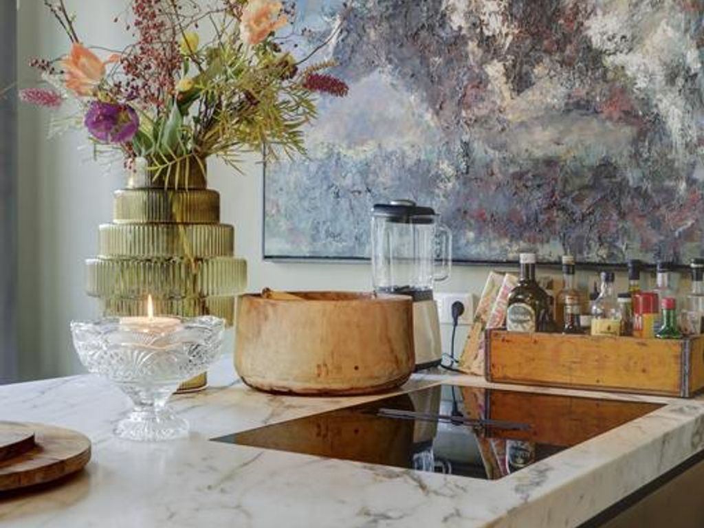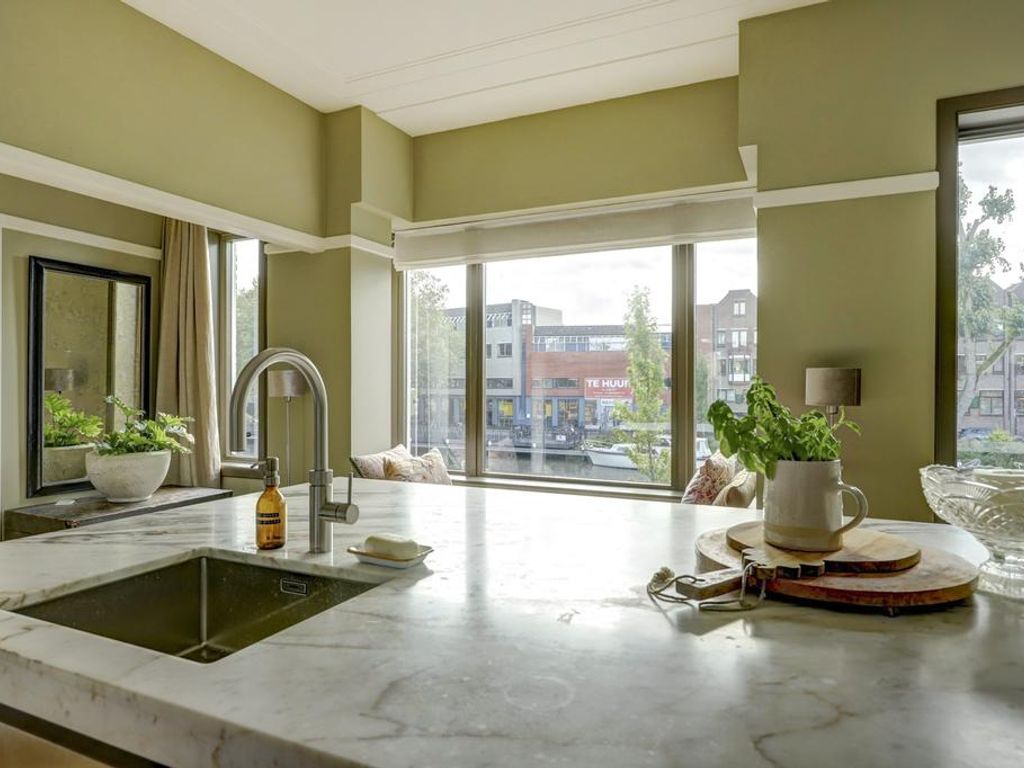 Prachtige royale open keuken van ca. 21 m² is voorzien van een (verwarmd!) natuurstenenblad, een ruime eetbar, inductiekookplaat met een ingebouwde afzuigsysteem, Quooker kokend waterkraan, oven met warmtelade en een vaaswasser. Tevens is de keukenruimte voorzien van een houtkachel en biedt het erkertje prachtig vrij uitzicht over het water.