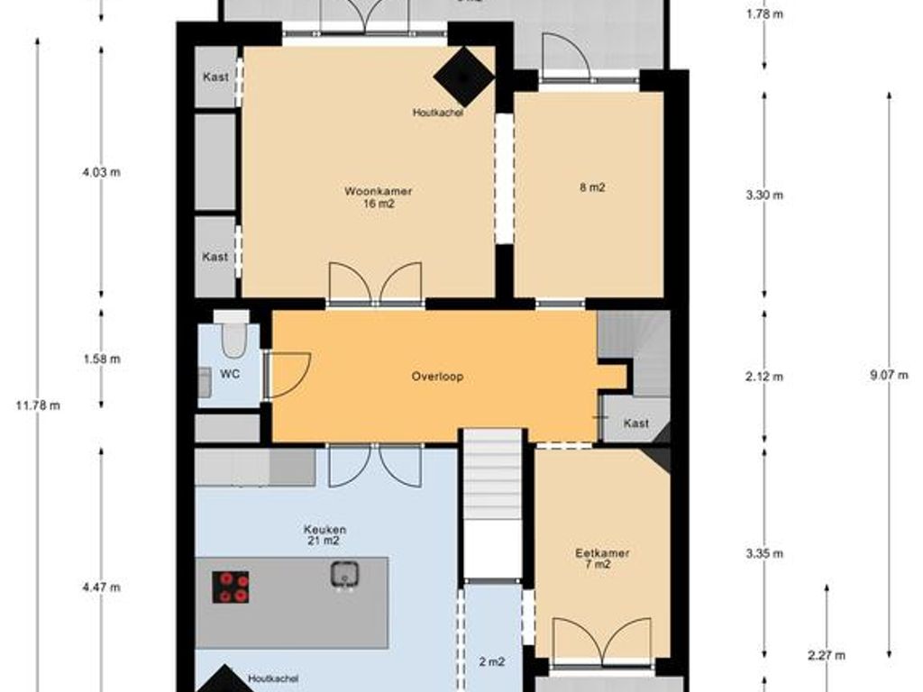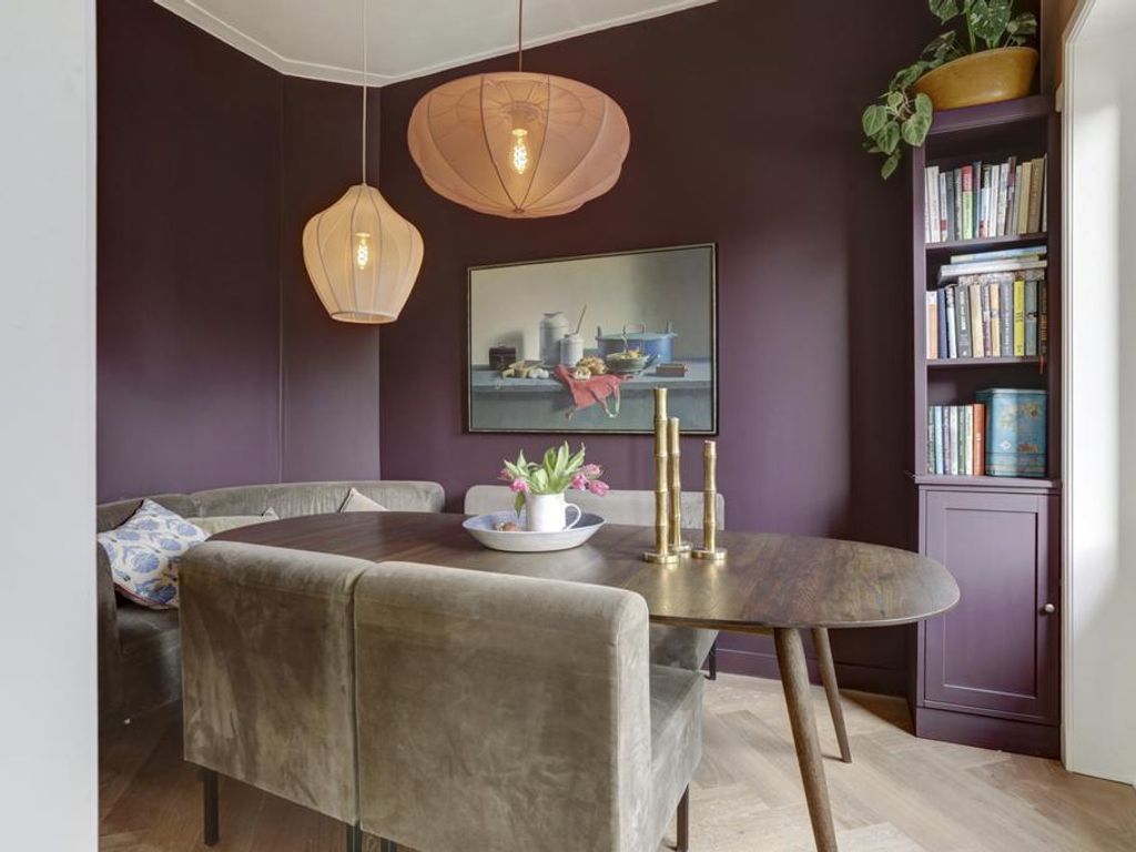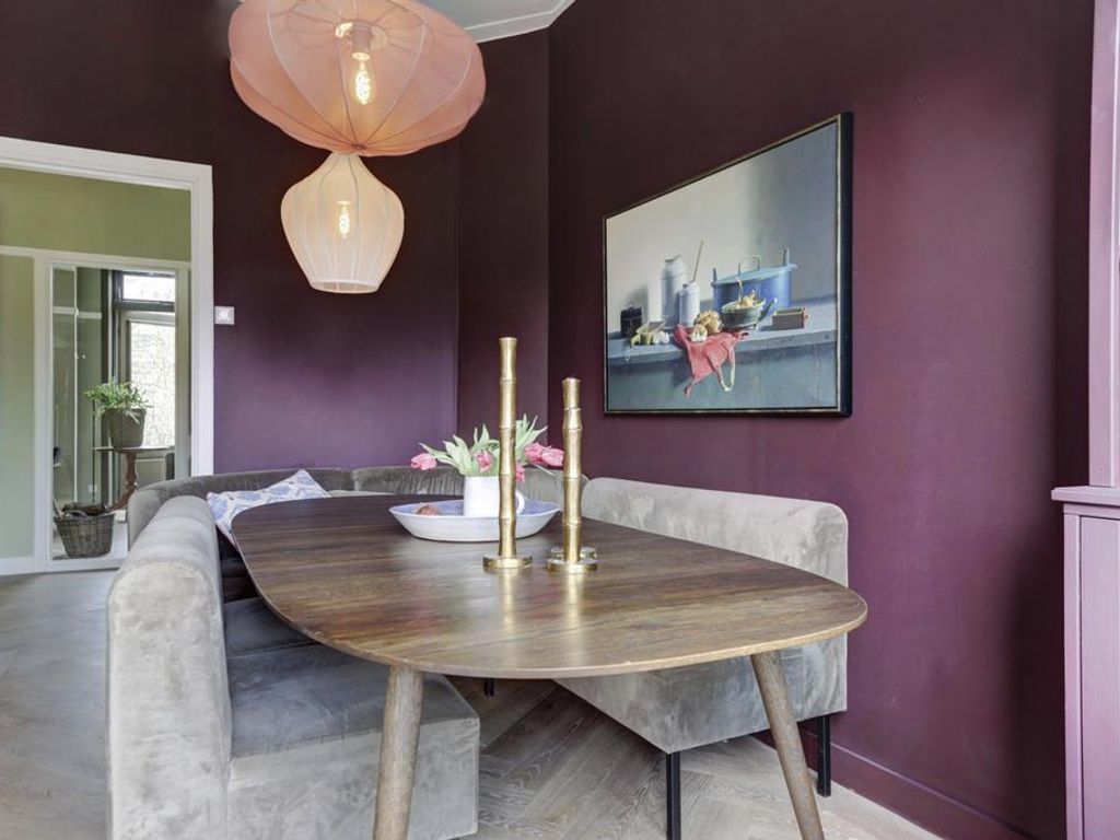 De naastgelegen zeer stijlvolle eetkamer van ca. 7 m² is te bereiken via de overloop en de keuken. Deze kamer is gelegen aan de voorzijde van de woning en is voorzien van een sfeervol balkonnetje (1) van ca. 2 m² met openslaande deuren.