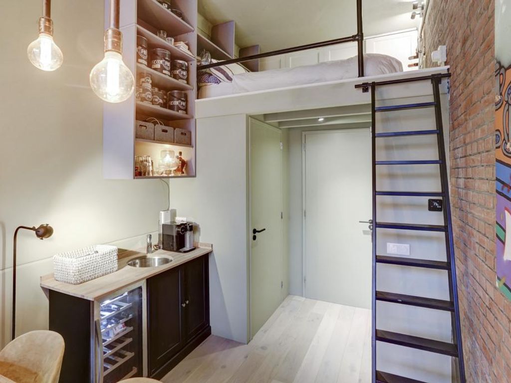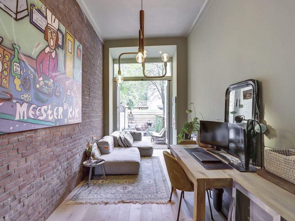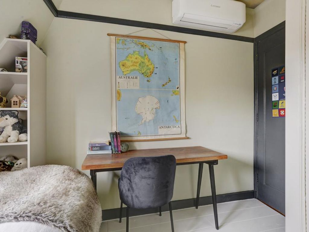 Doorloop naar de tuin-/slaapkamer van ca. 15 m² welke is voorzien van een zeer hoge plafond, de originele stenen muur, en deels nette gestucte wanden, een geïsoleerde vloer, een toiletruimte met wand- en vloerverwarming, pantry, slaapvliering en een airconditioning unit om te verwarmen en te koelen. Tevens bereik je middels de openslaande deuren de riante achtertuin van circa 10x4meter diep. De ruimte is ook uitstekend te gebruiken als kantoor aan huis/praktijkruimte.