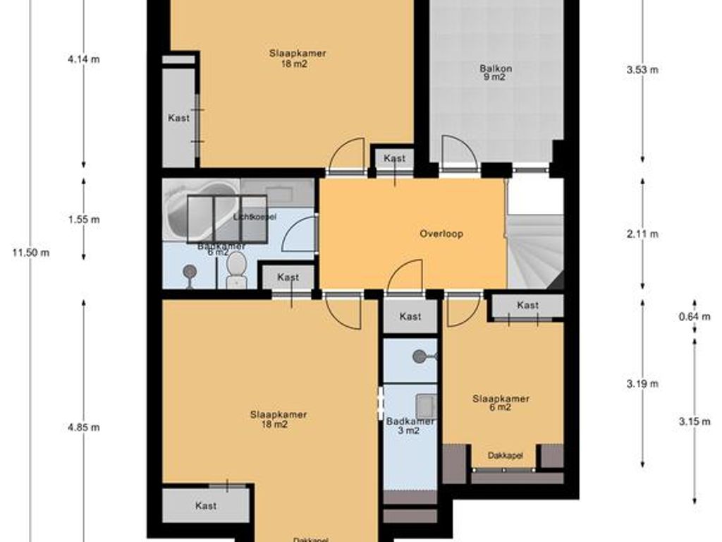 Middels de stijlvol beklede trap bereik je de ruime en sfeervolle overloop van de bovenwoning. Vanuit de centrale overloop zijn er allerlei doorkijkjes naar de verschillende ruimten. Tevens is op deze verdieping een trapkast aanwezig en een separate toiletruimte voorzien van een mooie natuurstenen achterwand en fonteintje.