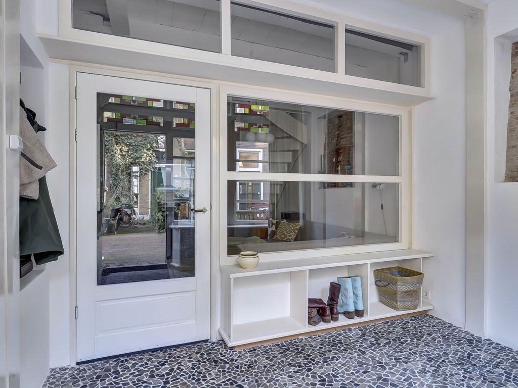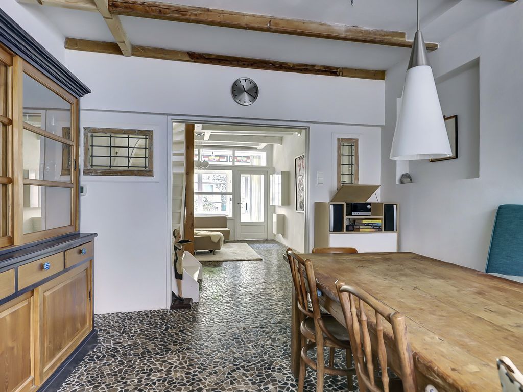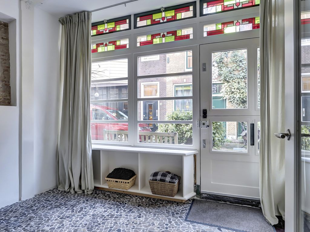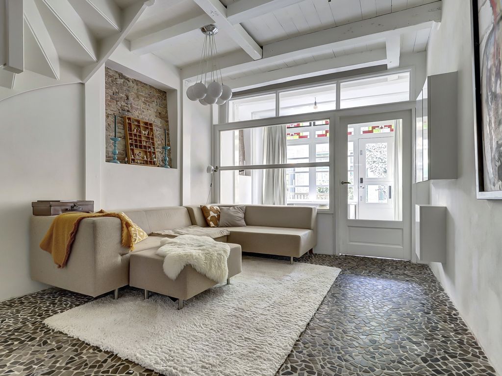 Bij binnenkomst valt direct het authentieke karakter van de woning op. In de ruime entree (ca. 8 m²) met vernieuwde meterkast en dubbel glas, zijn fraaie details zichtbaar zoals het glas-in-lood bovenlicht en balkenplafond. De gezellige woonkamer van circa 38 m² heeft een stoere uitstraling dankzij het natuurstenen mozaïekvloer met vloerverwarming (aangelegd in 2005) en het balkenplafond. De trapopgang naar de verdieping is mooi in de ruimte verwerkt.