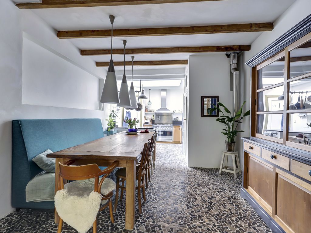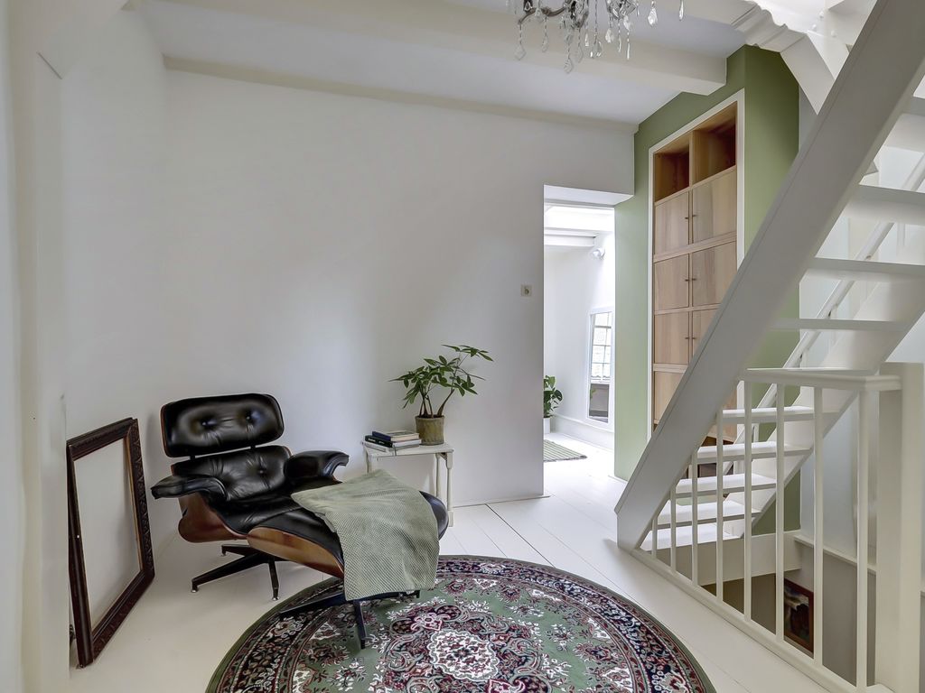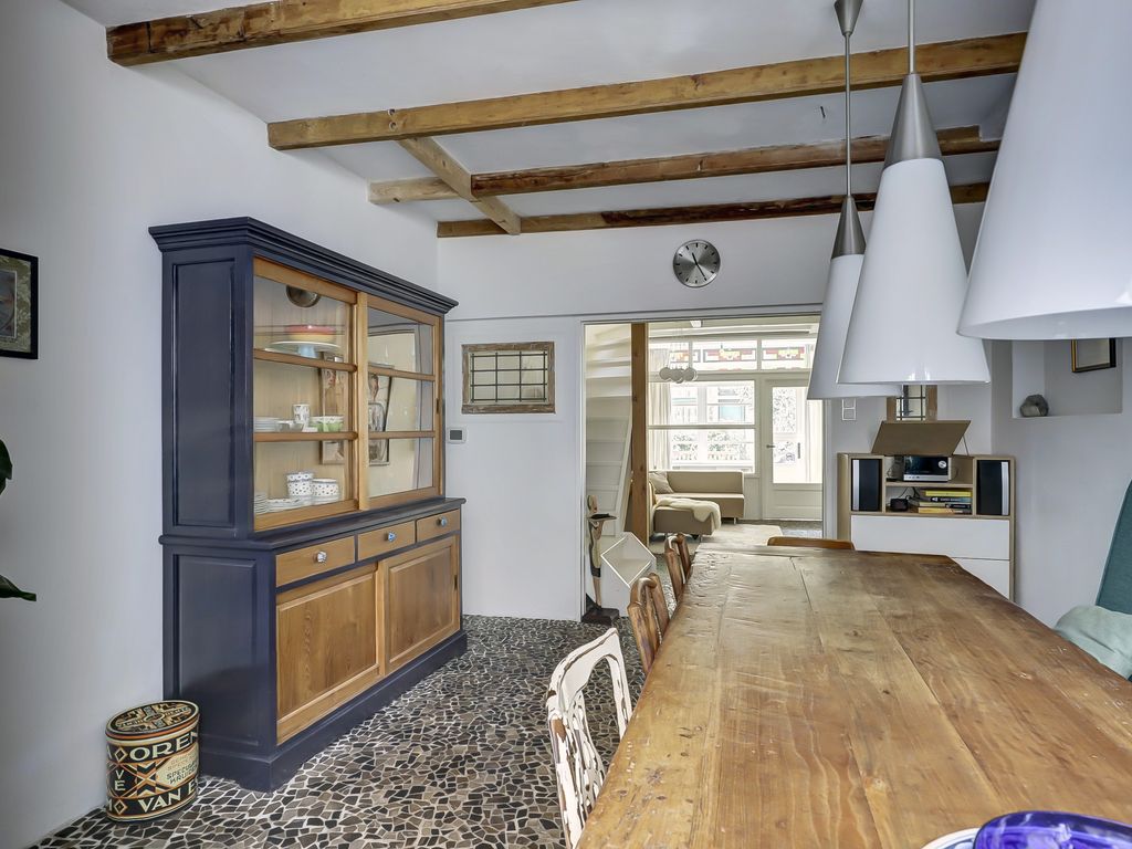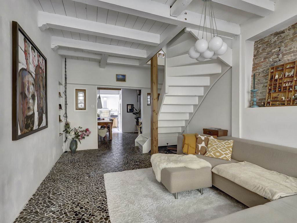 Bij binnenkomst valt direct het authentieke karakter van de woning op. In de ruime entree (ca. 8 m²) met vernieuwde meterkast en dubbel glas, zijn fraaie details zichtbaar zoals het glas-in-lood bovenlicht en balkenplafond. De gezellige woonkamer van circa 38 m² heeft een stoere uitstraling dankzij het natuurstenen mozaïekvloer met vloerverwarming (aangelegd in 2005) en het balkenplafond. De trapopgang naar de verdieping is mooi in de ruimte verwerkt.