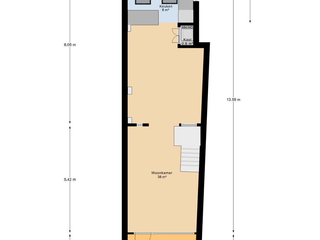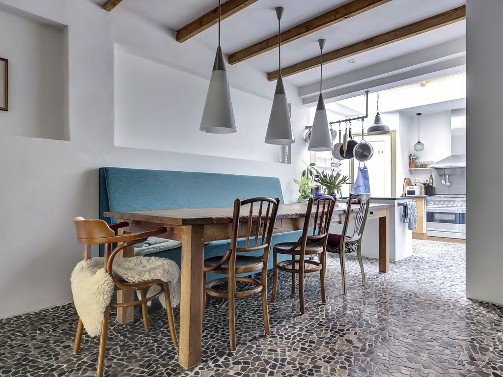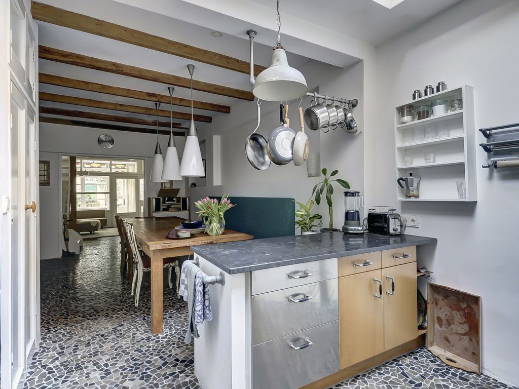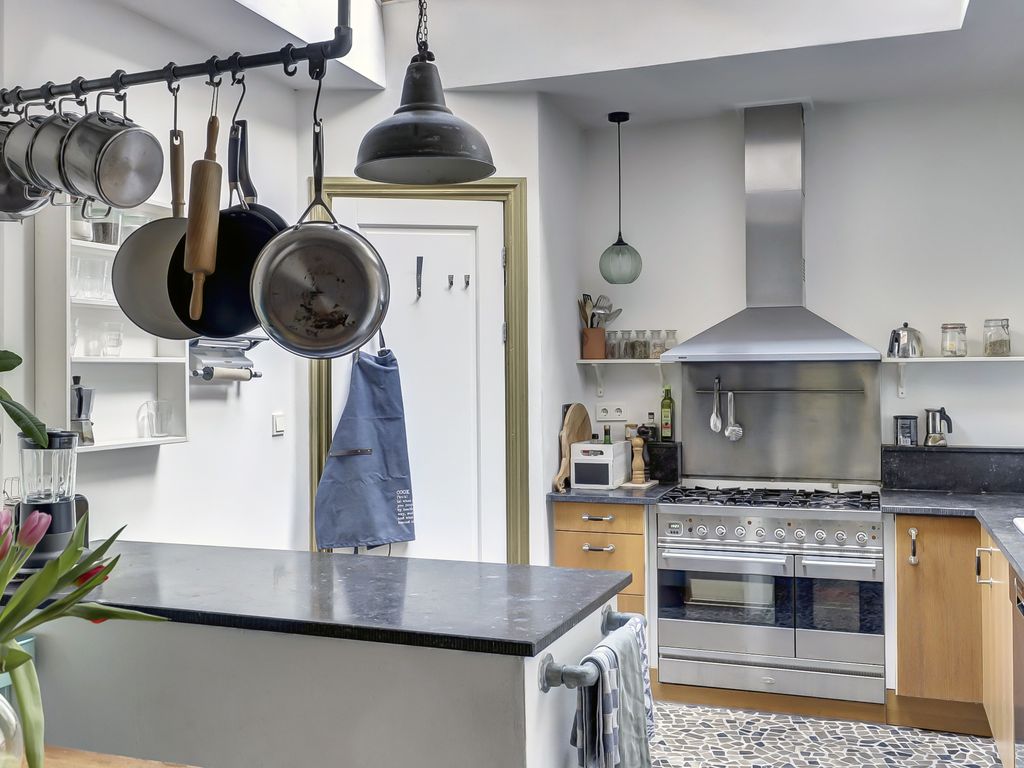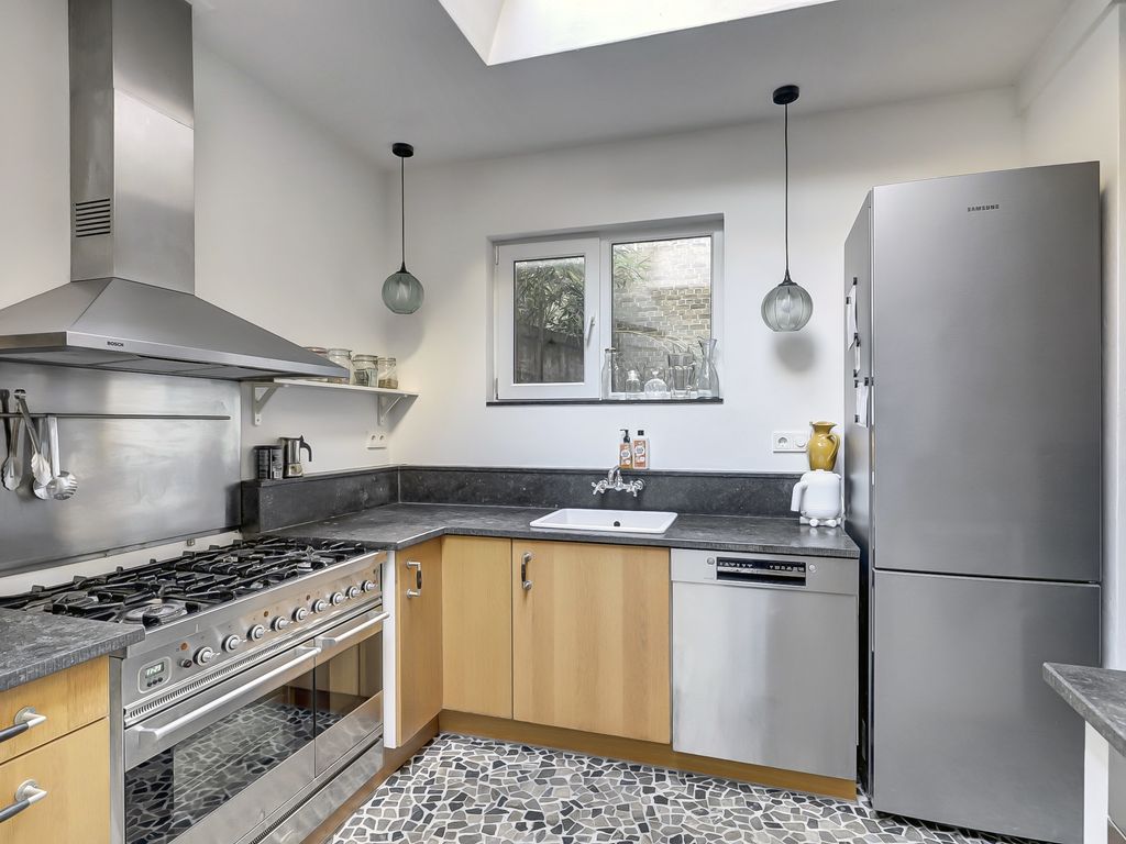Aan de achterzijde ligt de woonkeuken (ca. 8 m²) met twee lichtkoepels, wat zorgt voor veel lichtinval. De keuken is voorzien van een hardstenen blad, 5-pits gasfornuis met rvs-schouw voorzien van twee ovens (De grote is een gasoven, de kleinere een elektrische), een vaatwasser en een close-in boiler. De keukeninrichting is degelijk en functioneel, met diverse inbouwapparatuur. Achterin bevindt zich een vaste kast met aansluiting voor wasmachine en droger, en toegang tot een kleine berging (2 m²). De lichtkoepel is elektrisch te openen en sluit automatisch bij regen.