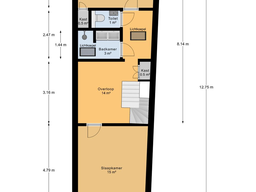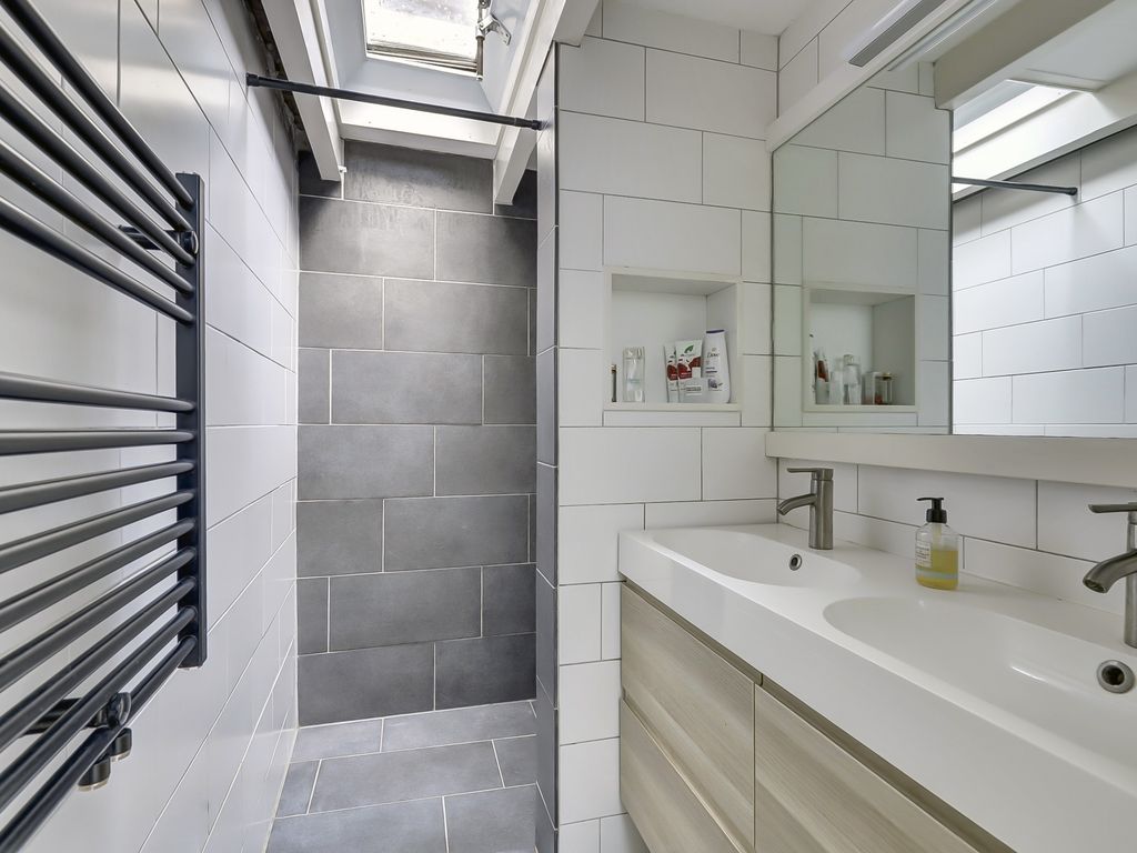 Een verrassend royale overloop van circa 14 m² geeft toegang tot twee slaapkamers en de badkamer. Aan de voorzijde ligt een ruime slaapkamer van ca. 15 m² met veel lichtinval en een prettig uitzicht over de straat. Aan de achterzijde bevindt zich een slaapkamer van ca. 8 m², eveneens met fijn lichtinval. Hier bevinden zich ook een aparte toiletruimte en een nette badkamer met moderne grijs-witte betegeling, een dubbele wastafel met meubel, een design handdoekradiator en een inloopdouche onder een daklicht.