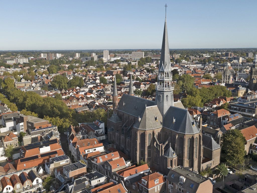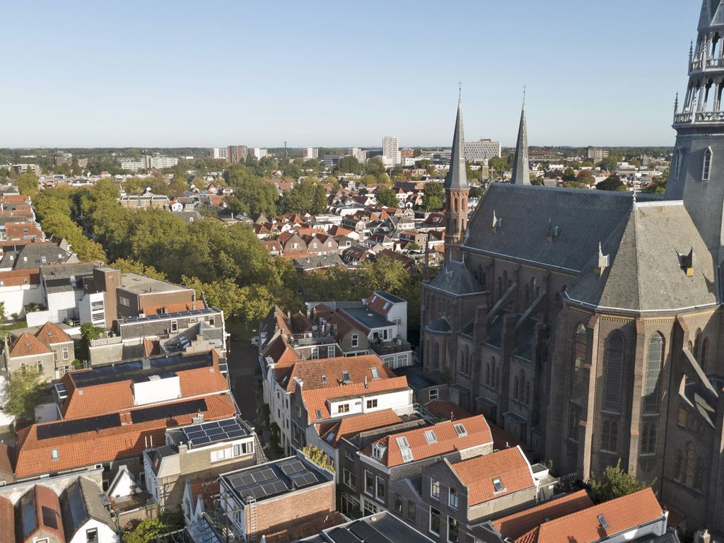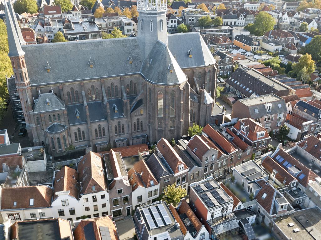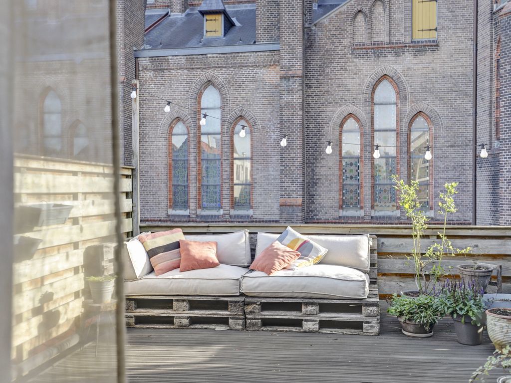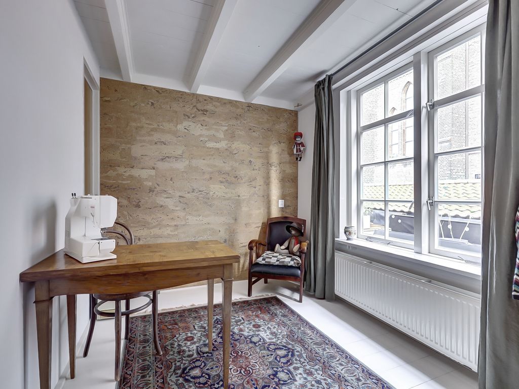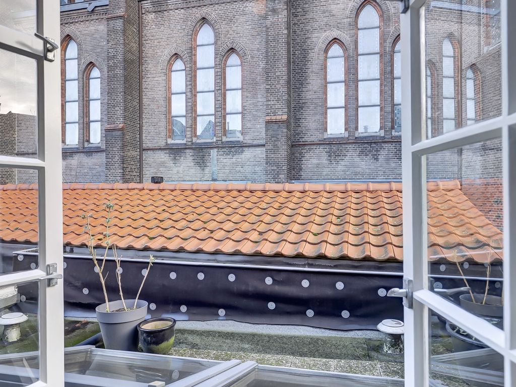 Vanaf het begin werd ik gegrepen door het uitzicht vanaf het ruime dakterras op de Gouwekerk. Het is een plek waar de seizoenen echt zichtbaar zijn: zomers kun je er in alle rust en vrijheid buiten zitten, terwijl in de wintermaanden de prachtig gekleurde ramen van de kerk sfeervol oplichten en zorgen voor een bijna magisch uitzicht.