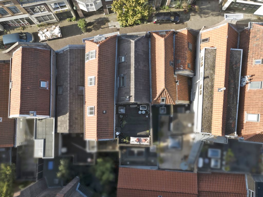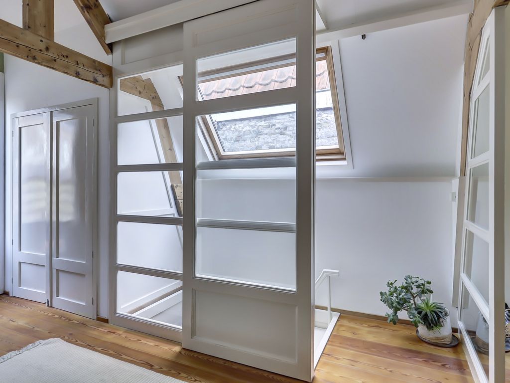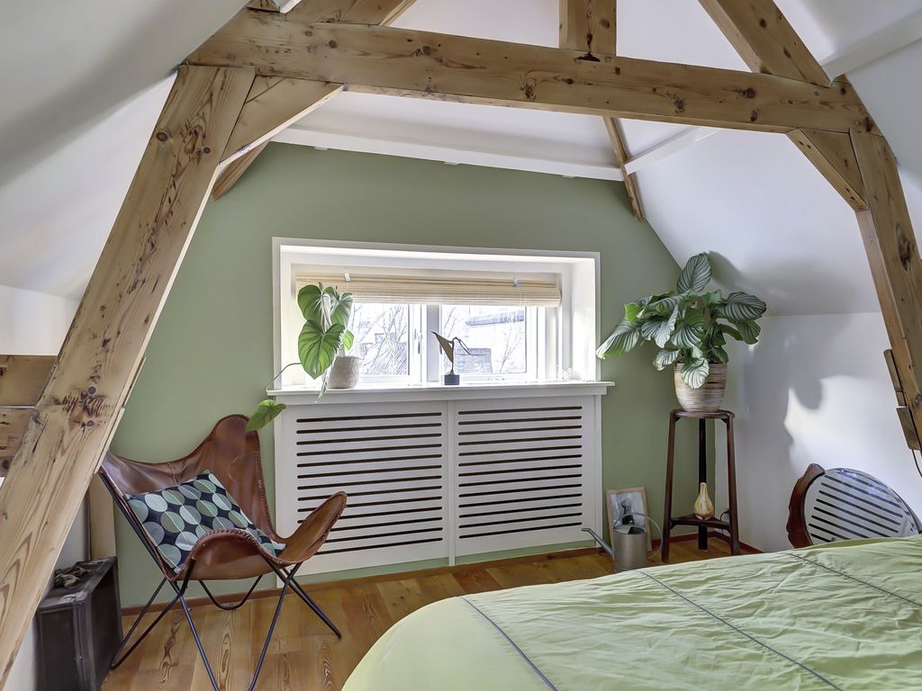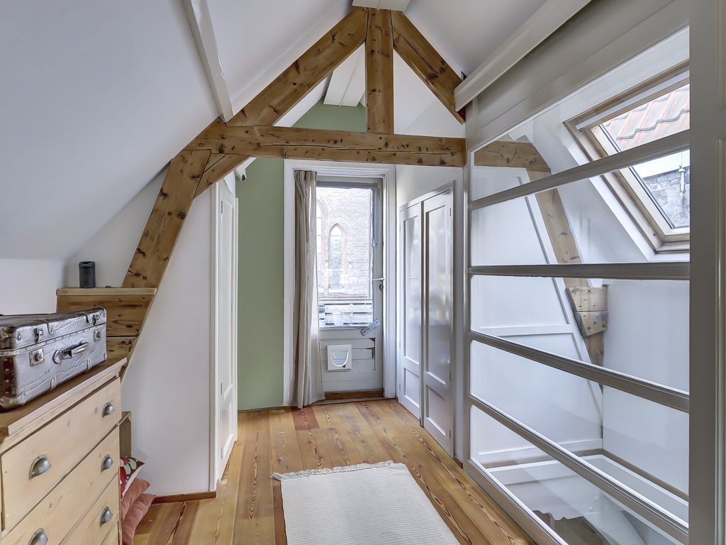 Via een vaste trap bereik je de sfeervolle zolderverdieping. De dakconstructie is in 2024 geïsoleerd met minerale wol, en het houtwerk is fraai in het zicht gelaten. De royale slaapkamer van ca. 16 m² heeft een warme houten vloer, twee dakramen en veel bergruimte in vaste kasten. Een stijlvolle glazen wand met schuifdeur scheidt het trappenhuis van de slaapkamer. Achter deze kamer bevindt zich de toegang tot het heerlijke dakterras van ca. 22 m². Een unieke plek midden in de stad, met volop zon en ruimte voor een eettafel of loungestoelen.