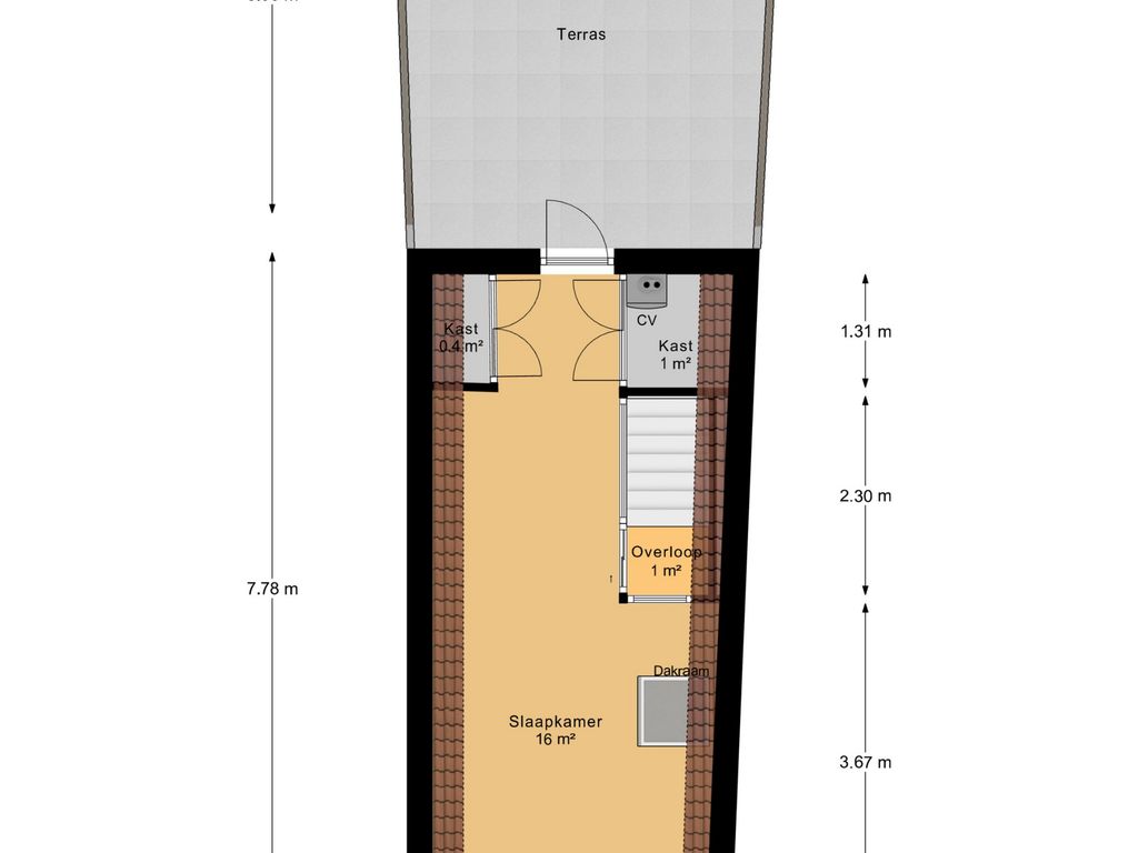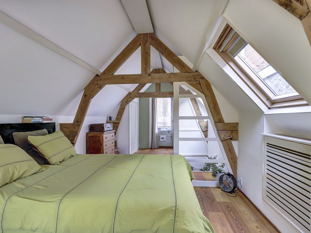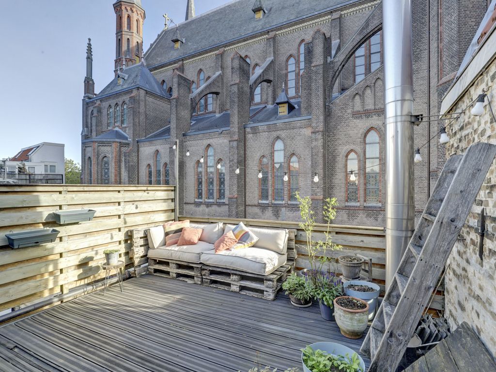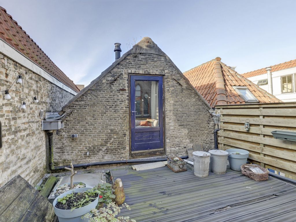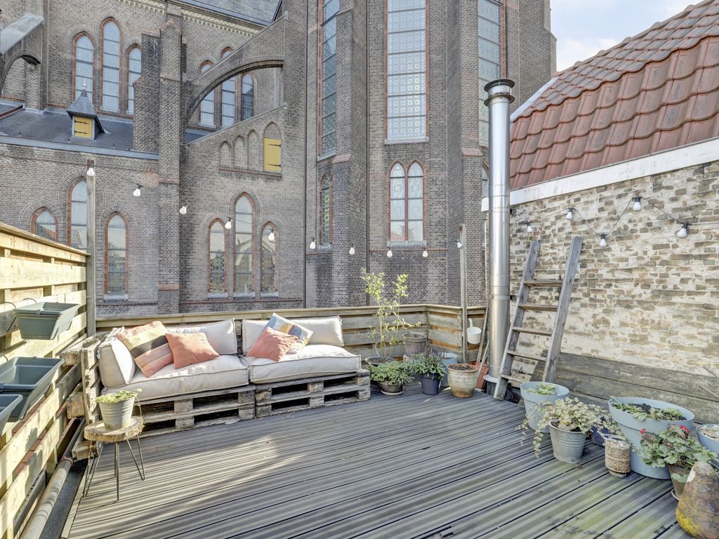 Via een vaste trap bereik je de sfeervolle zolderverdieping. De dakconstructie is in 2024 geïsoleerd met minerale wol, en het houtwerk is fraai in het zicht gelaten. De royale slaapkamer van ca. 16 m² heeft een warme houten vloer, twee dakramen en veel bergruimte in vaste kasten. Een stijlvolle glazen wand met schuifdeur scheidt het trappenhuis van de slaapkamer. Achter deze kamer bevindt zich de toegang tot het heerlijke dakterras van ca. 22 m². Een unieke plek midden in de stad, met volop zon en ruimte voor een eettafel of loungestoelen.