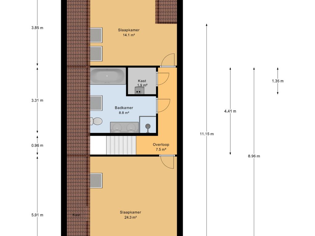 De ruime badkamer (ca. 8,8 m²) is voorzien van een ligbad, douche, dubbele wastafel en toilet.