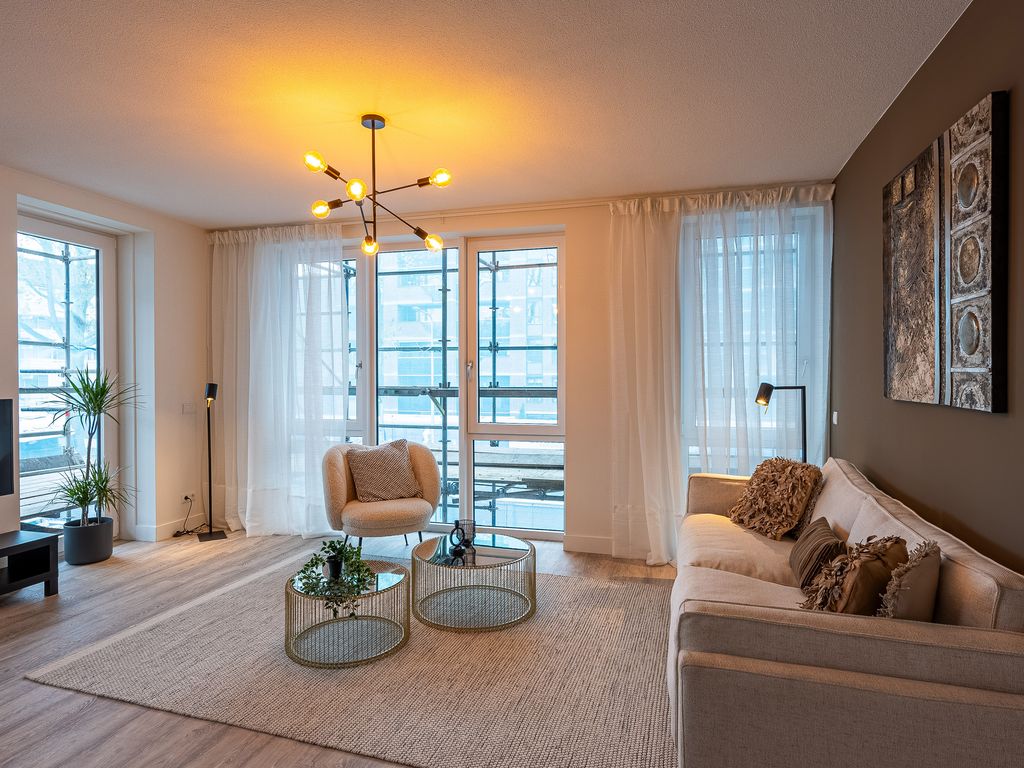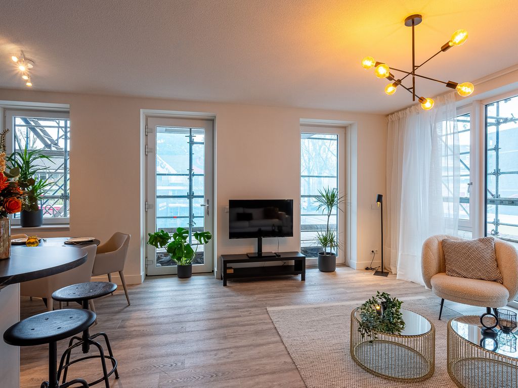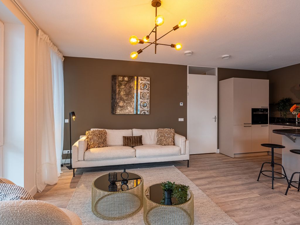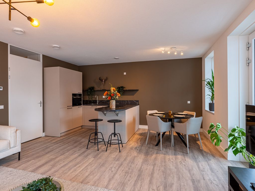 Bij binnenkomst valt direct de verzorgde afwerking op. De ruime hal geeft toegang tot het moderne toilet, de meterkast en een praktische berging met aansluitingen voor de wasmachine en droger. De woonkamer is licht en overzichtelijk, met grote ramen die zorgen voor een prettige sfeer. De houtlook pvc vloer met vloerverwarming en -koeling die in het gehele appartement aanwezig is zorgt voor comfort het hele jaar door.