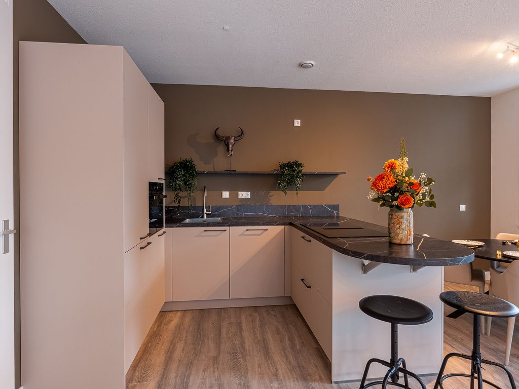 De open keuken is modern uitgevoerd in een U-opstelling. Er is veel werkruimte, kastruimte en de keuken is uitgerust met een eetbar, inductiekookplaat voorzien van geïntegreerde afzuiging, koelvriescombinatie, vaatwasser en combi oven magnetron. Het geheel sluit naadloos aan op de woonkamer, waardoor het een praktische en fijne leefruimte vormt.