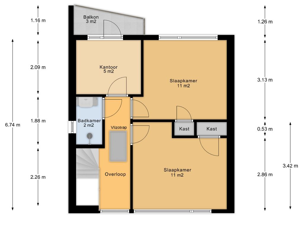 De eerste verdieping beschikt over twee ruime slaapkamers en een extra kamer, uitstekend geschikt als thuiswerkplek, kantoor of hobbyruimte, met toegang tot het balkon. De badkamer is compact en functioneel ingericht met een douche en wastafel. Op de overloop bevindt zich tevens de vlizotrap naar de zolder.