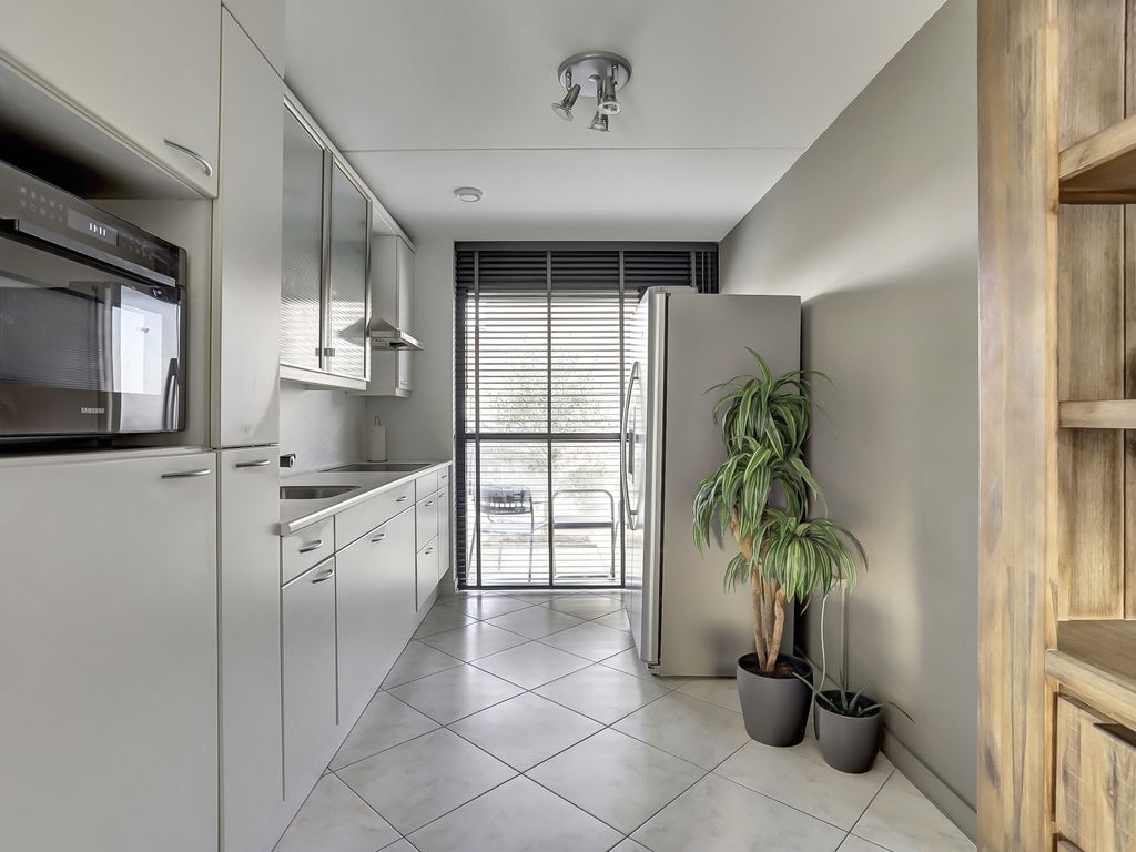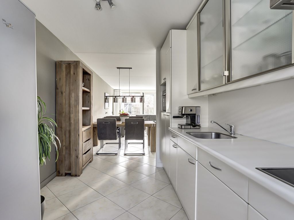 Aan de voorzijde van de woning bevindt zich de keuken. Deze is praktisch ingericht en voorzien van een apothekerskast en diverse inbouwapparatuur, waaronder een keramische kookplaat, afzuigkap, vaatwasser en oven. Daarnaast is er een losstaande Amerikaanse koelkast.