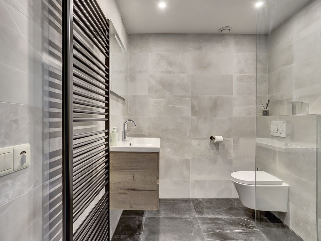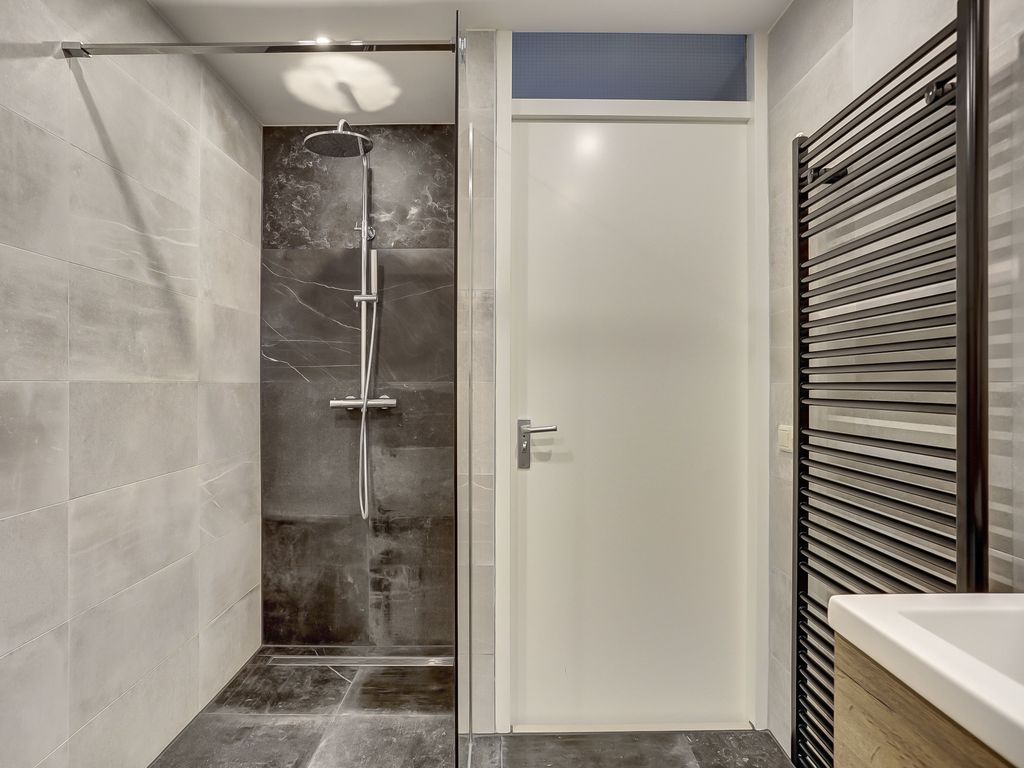 De moderne badkamer is voorzien van een ruime inloopdouche, een wastafelmeubel, handdoekradiator en toilet.