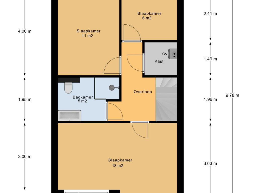 Op de overloop bevindt zich een aparte berging/kast met de cv-installatie, wat tevens zorgt voor extra praktische bergruimte.