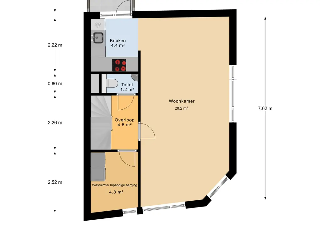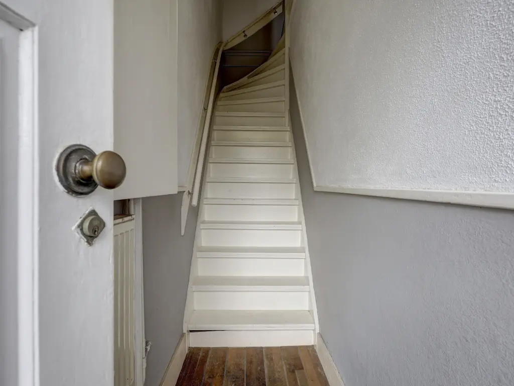 Via de entree op de begane grond betreedt u de woning, waar zich de trapopgang naar de eerste verdieping bevindt.