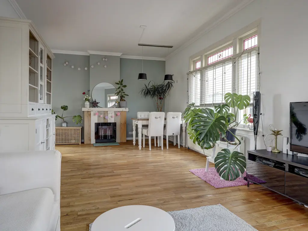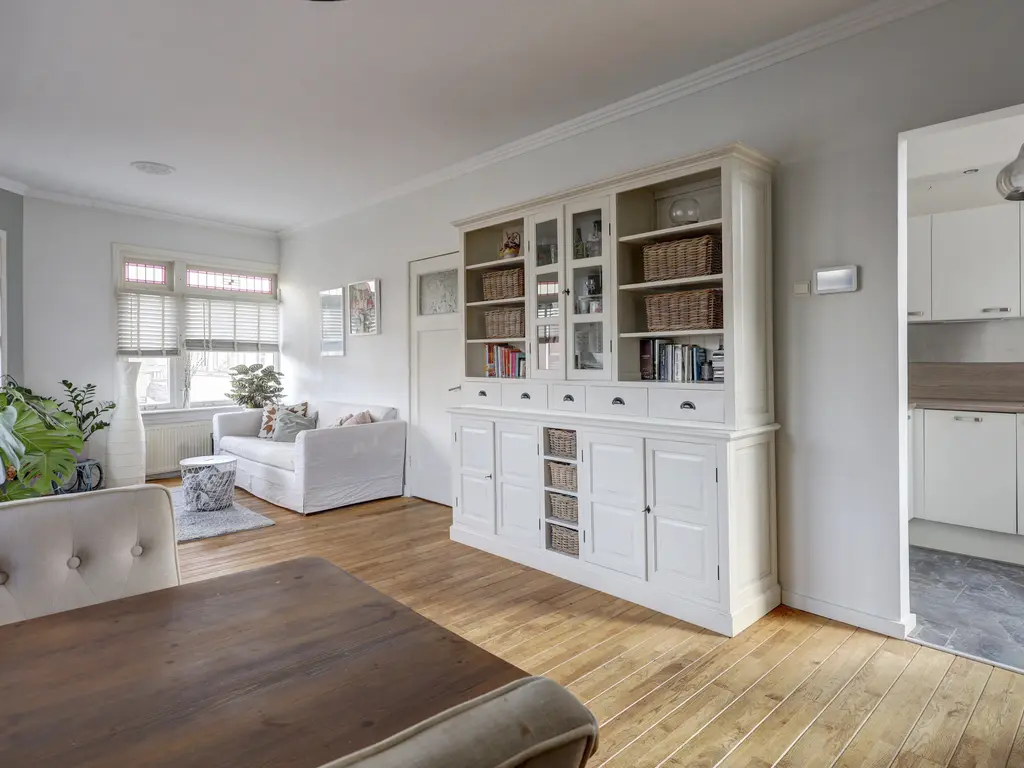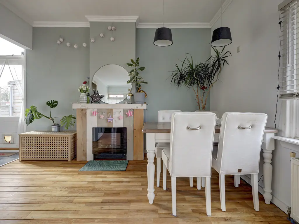 De royale woonkamer ca. 28m² wordt gekenmerkt door veel lichtinval dankzij de hoekligging. De ruimte is afgewerkt met een warme houten vloer en lichte wanden, wat zorgt voor een frisse en uitnodigende uitstraling. De woonkamer biedt voldoende ruimte voor zowel een comfortabele zithoek als een gezellige eethoek. Aan de achterzijde van de woonkamer bevindt zich een schouw met een sfeervolle elektrische haard.