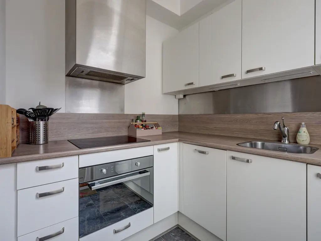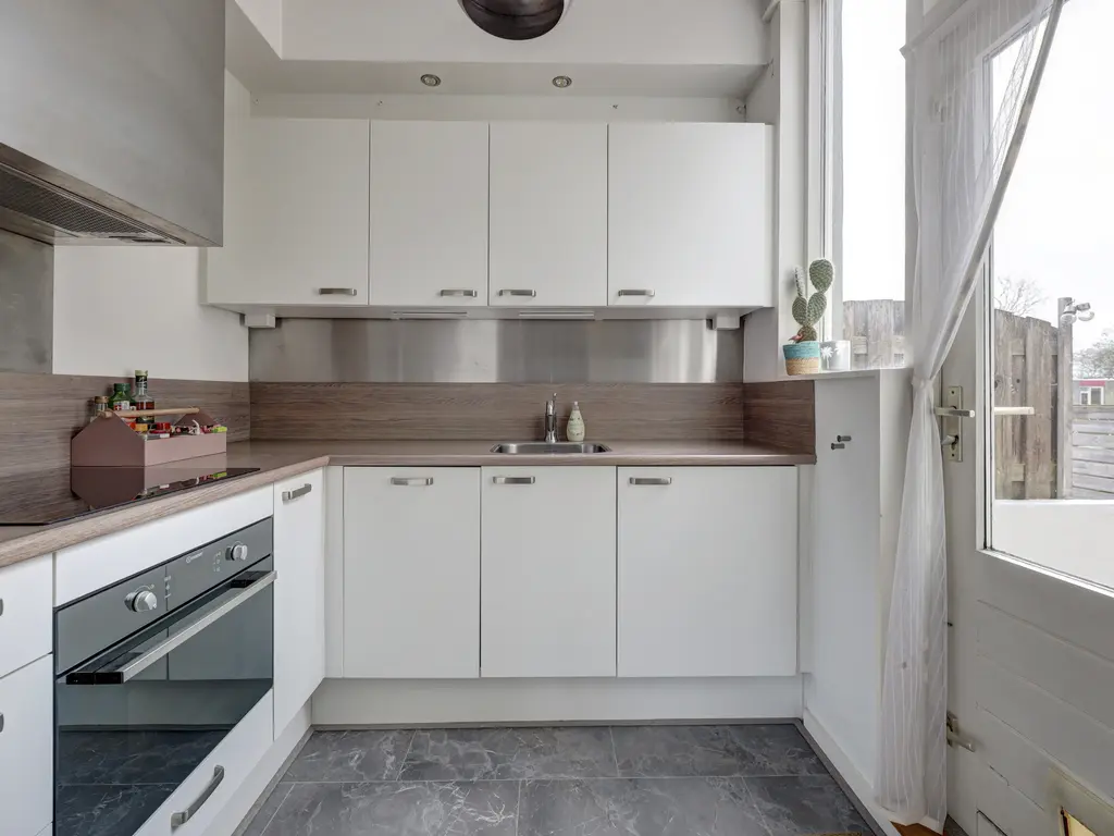Aan de achterzijde treft u de nette, moderne keukenruimte met een hoekopstelling in lichte kleurstelling, voorzien van diverse inbouwapparatuur, waaronder een oven, inductiekookplaat vaatwasser koelkast en afzuigkap, en met voldoende kastruimte. Vanuit de keuken heeft u toegang tot het dakterras (ligging zuidoosten) ca. 6m².