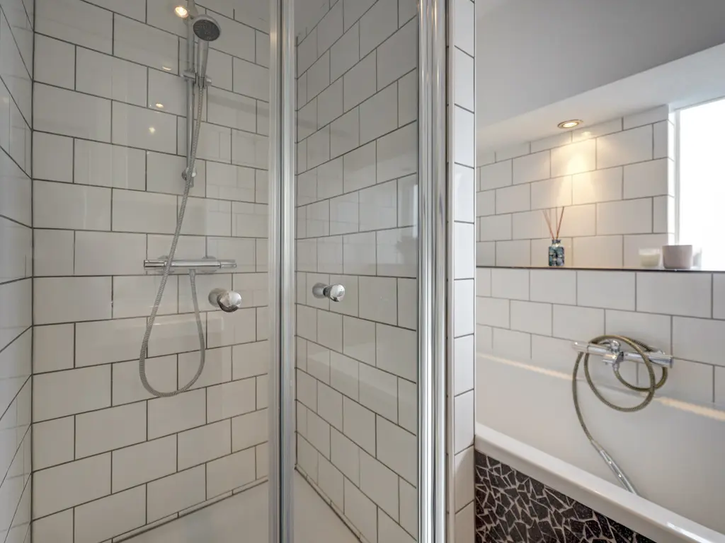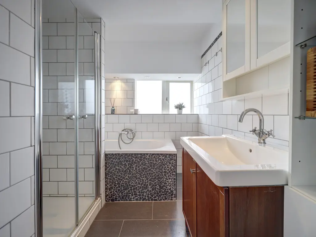 De badkamer is modern uitgevoerd en beschikt over een douchecabine, ligbad en wastafelmeubel. De afwerking met lichte tegels geeft de ruimte een frisse en verzorgde uitstraling.