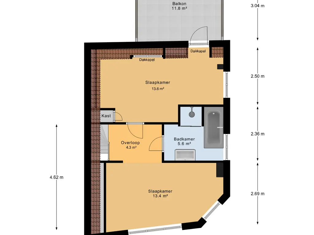 De royale slaapkamer ca. 13,5m² aan de achterzijde is voorzien van een dakkapel, wat zorgt voor extra ruimte en daglicht, en toegang tot het ruime dakterras (ligging oost/ zuidwest) ca. 12m².