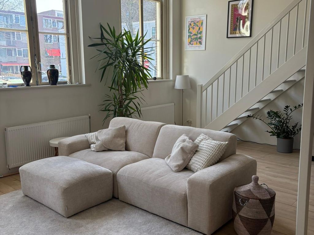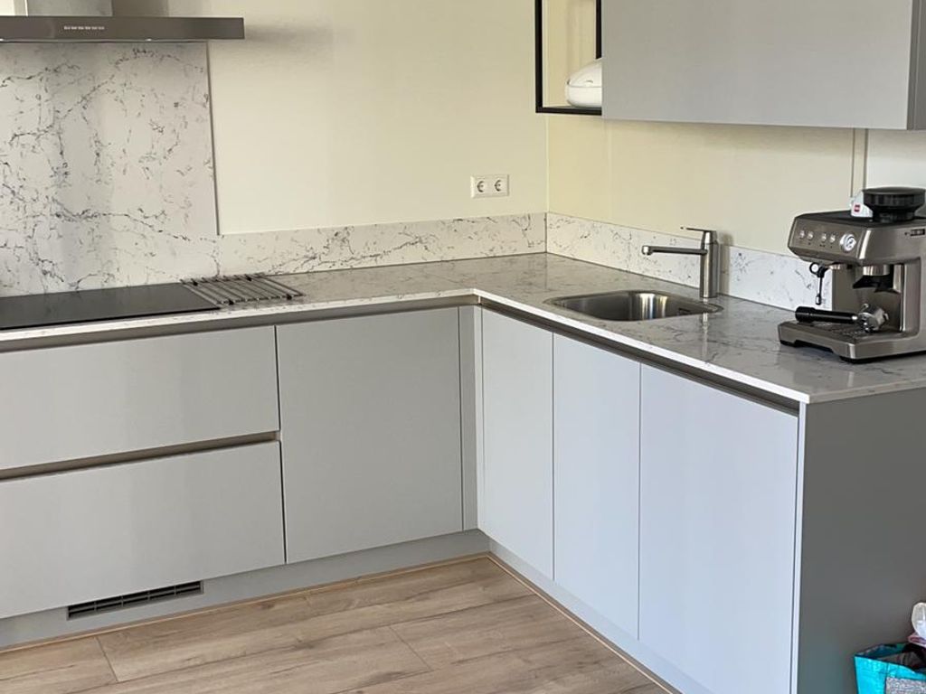 Ruime en lichtvriendelijke living ca. 46,7m2 voorzien van mooie hoge raampartijen aan de voorzijde, trapopgang naar verdieping en moderne hoekopgestelde keuken (Bruynzeel) met inductie kookplaat, afzuigkap, combi-oven, vaatwasser en koelkast met vriesvak.