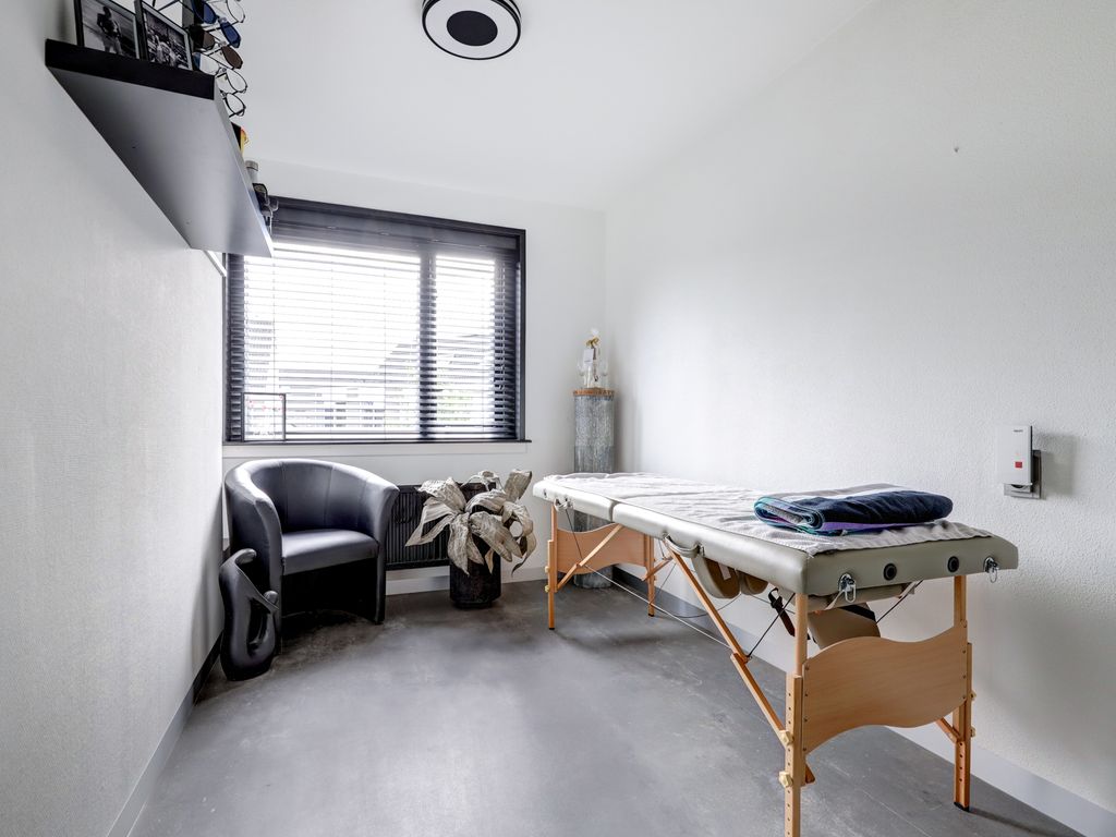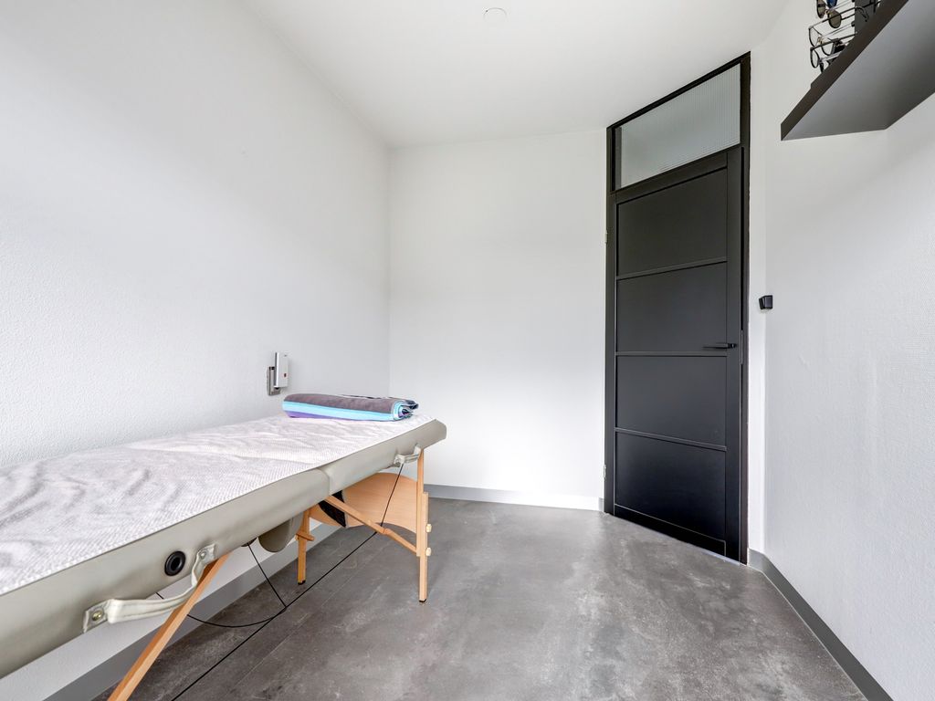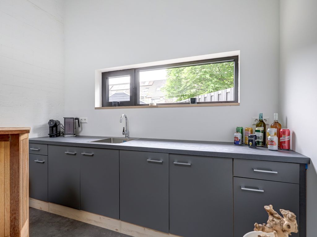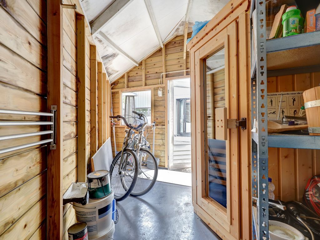 De garage (ca. 5,68 m x 2,88 m, 16 m²) naast de woning is in 2021 volledig verbouwd en geïsoleerd. Met verhoogde nok, pantry, radiator en warm-/koudwateraansluiting is deze ruimte ideaal als werkplek of studio. De achtergevel is afgewerkt met onderhoudsvrij Keralit.