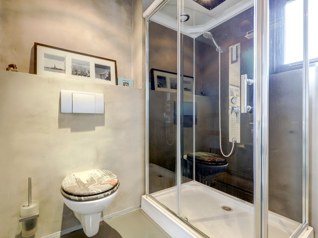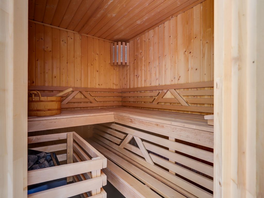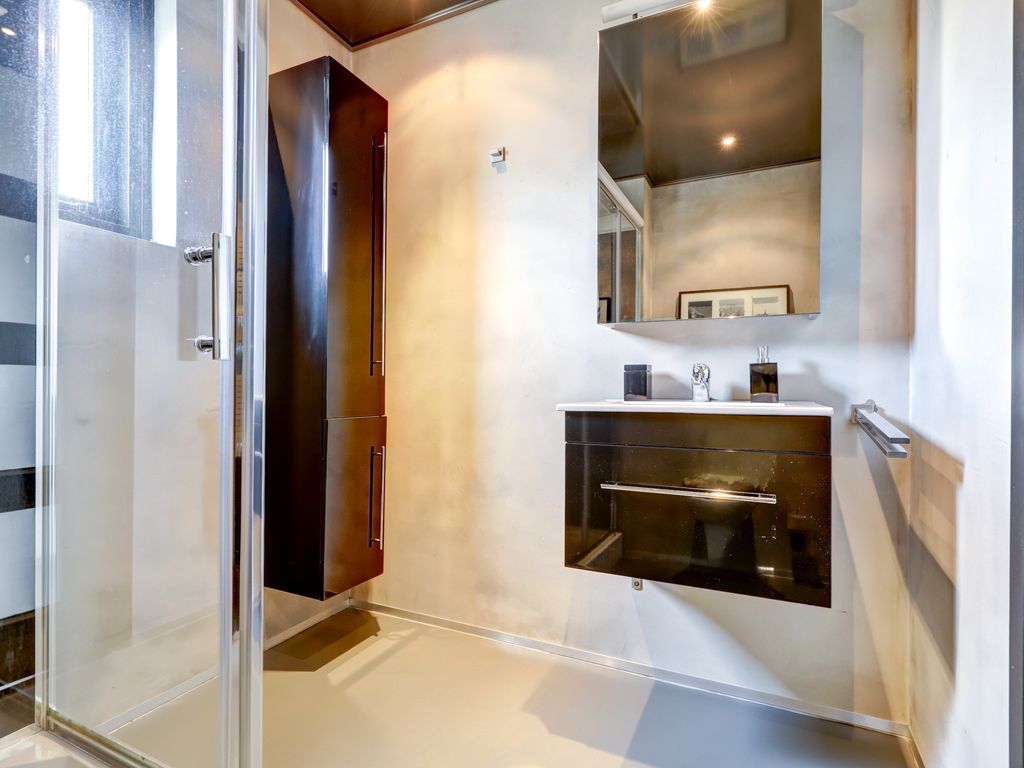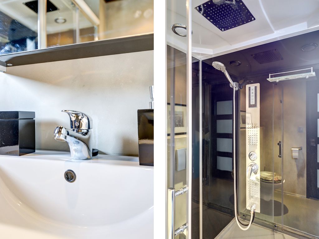 De luxe badkamer (2019, ca. 2,37 m x 2,06 m, 5 m²) beschikt over een moderne douchecabine met regendouche, zijstralers, standaard douche, verlichting, radio, een wastafelmeubel, toilet en spiegelkast met verlichting. De gehele verdieping is voorzien van een vinyl vloer.