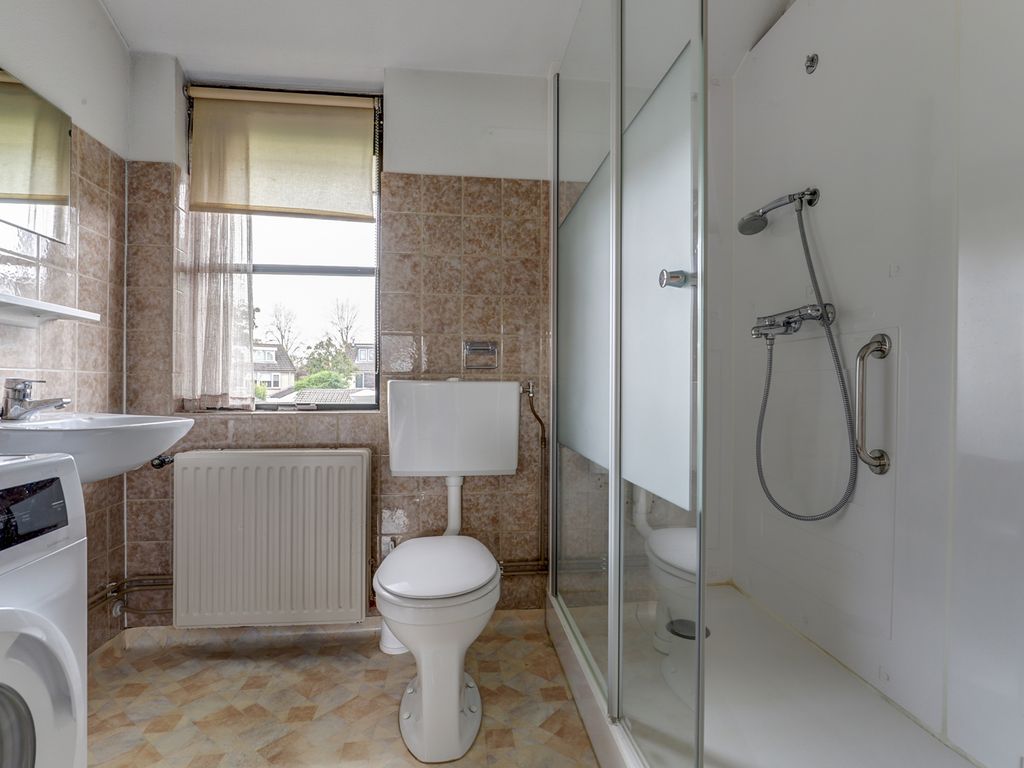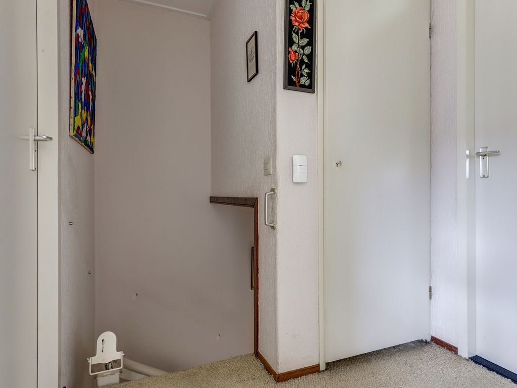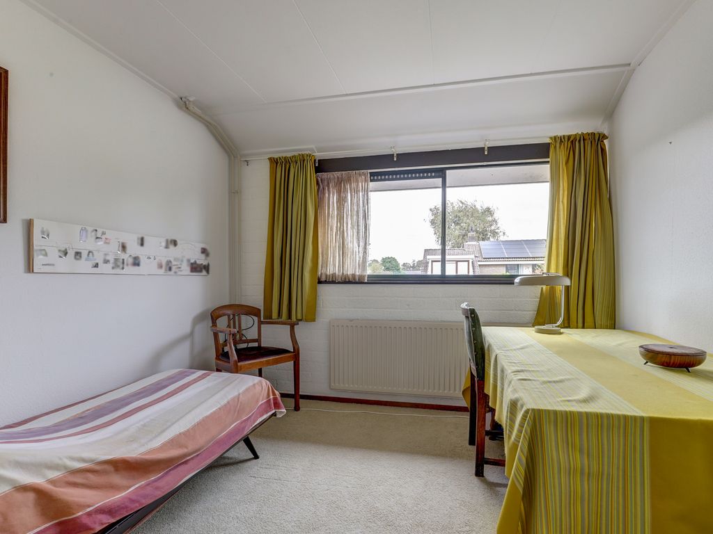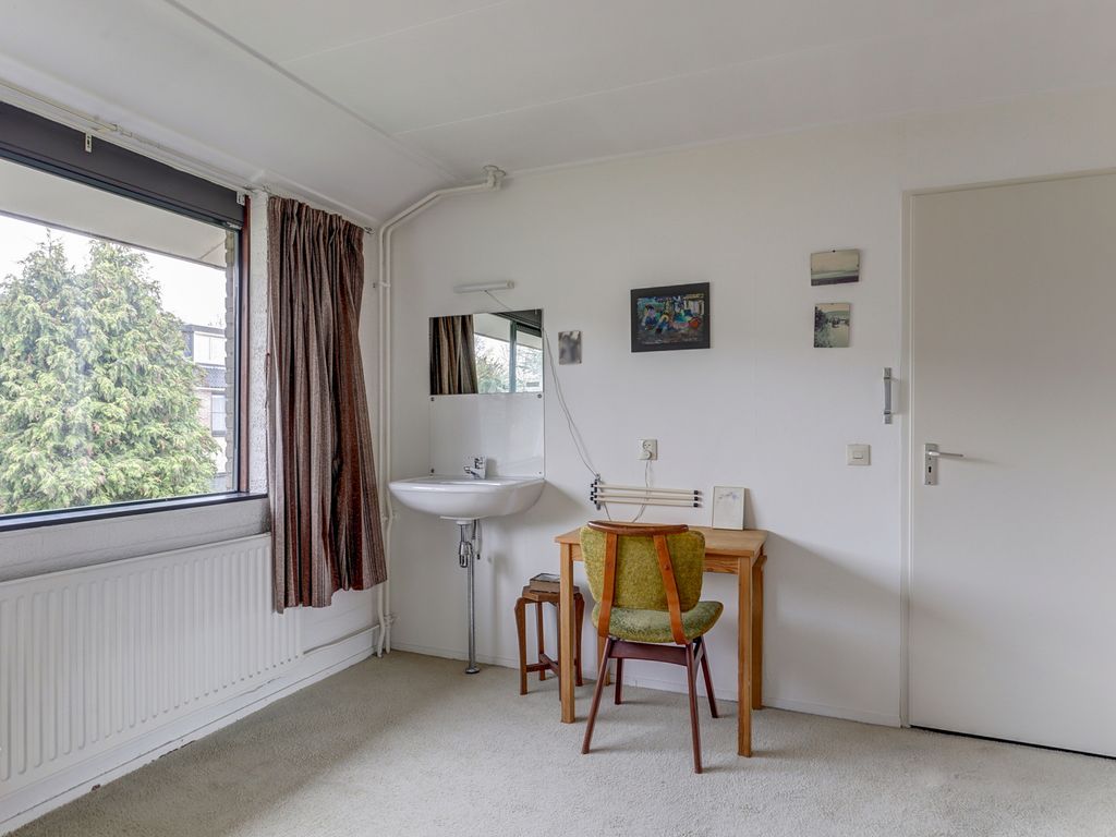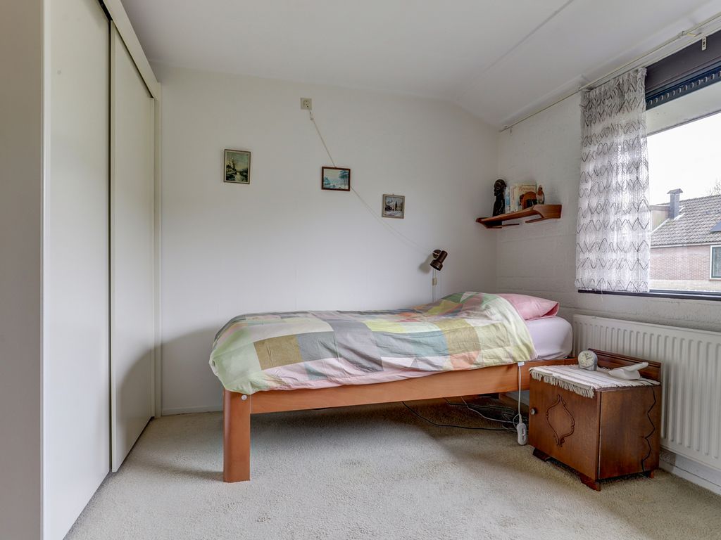 Op de eerste verdieping bevinden zich drie kamers, twee ruim bemeten slaapkamers en een derde die goed te gebruiken is als kinder-, werk- of logeerkamer. In het midden van de verdieping zit een vaste kast met de cv-ketel (Intergas, 2008), de mechanische ventilatie en de omvormer van de zonnepanelen. De badkamer is functioneel ingedeeld en beschikt over een inloopdouche, toilet, wastafel en aansluitingen voor de wasmachine. Ook hier geldt dat de ruimte netjes is, maar duidelijk uitnodigt om met een eventuele renovatie een frisse en eigentijdse badkamer te realiseren. Via een luik is een bergvliering bereikbaar.