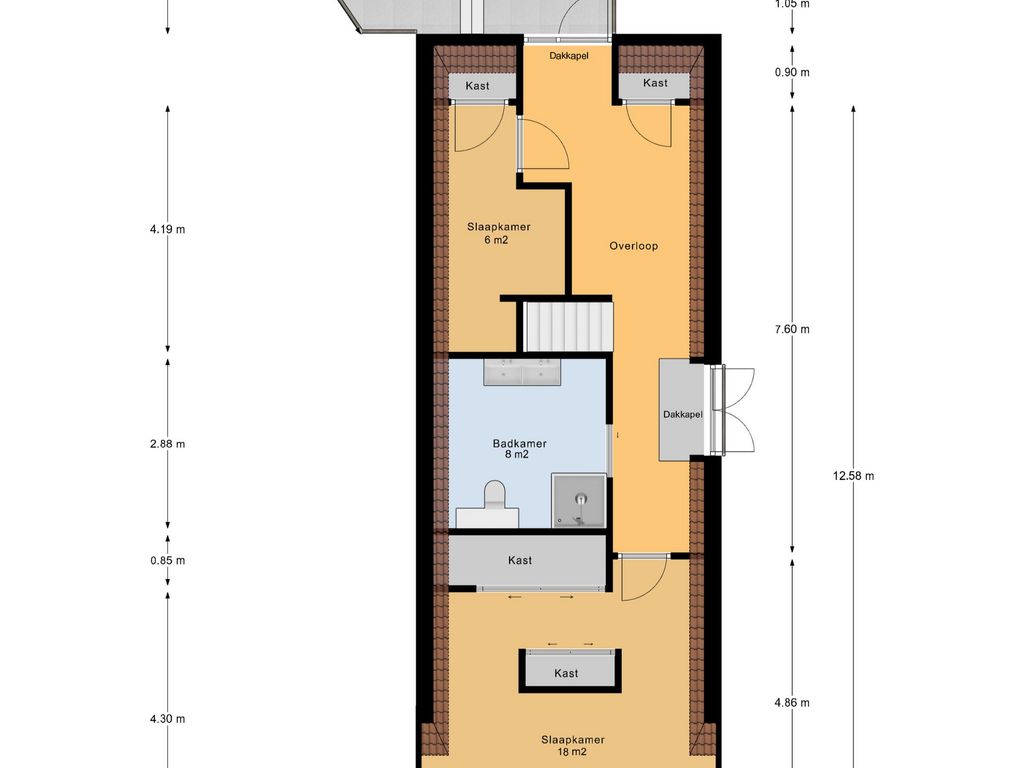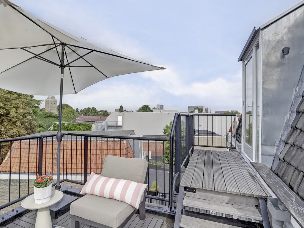 Op de tweede woonlaag (verdieping 3) vind je twee slaapkamers, waaronder een royale hoofdslaapkamer (18 m²) aan de voorzijde, voorzien van airconditioning en stijlvolle maatwerkkasten. De tweede slaapkamer (ca. 6 m²) is ideaal als babykamer of werkkamer, al beschikt deze niet over een raam. De luxe badkamer is uitgevoerd met modern sanitair, inloopdouche, wastafelmeubel en fraaie afwerking. Vanuit de overloop is er toegang tot het zonnige dakterras (10 m²) aan de achterzijde welke een schitterend uitzicht biedt, gelegen op het zuidwesten – ideaal voor ontspanning in de zon op elk moment van de dag.