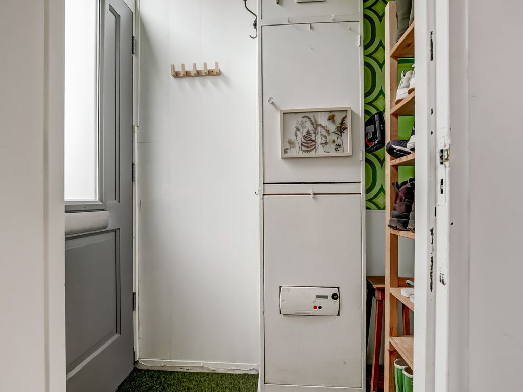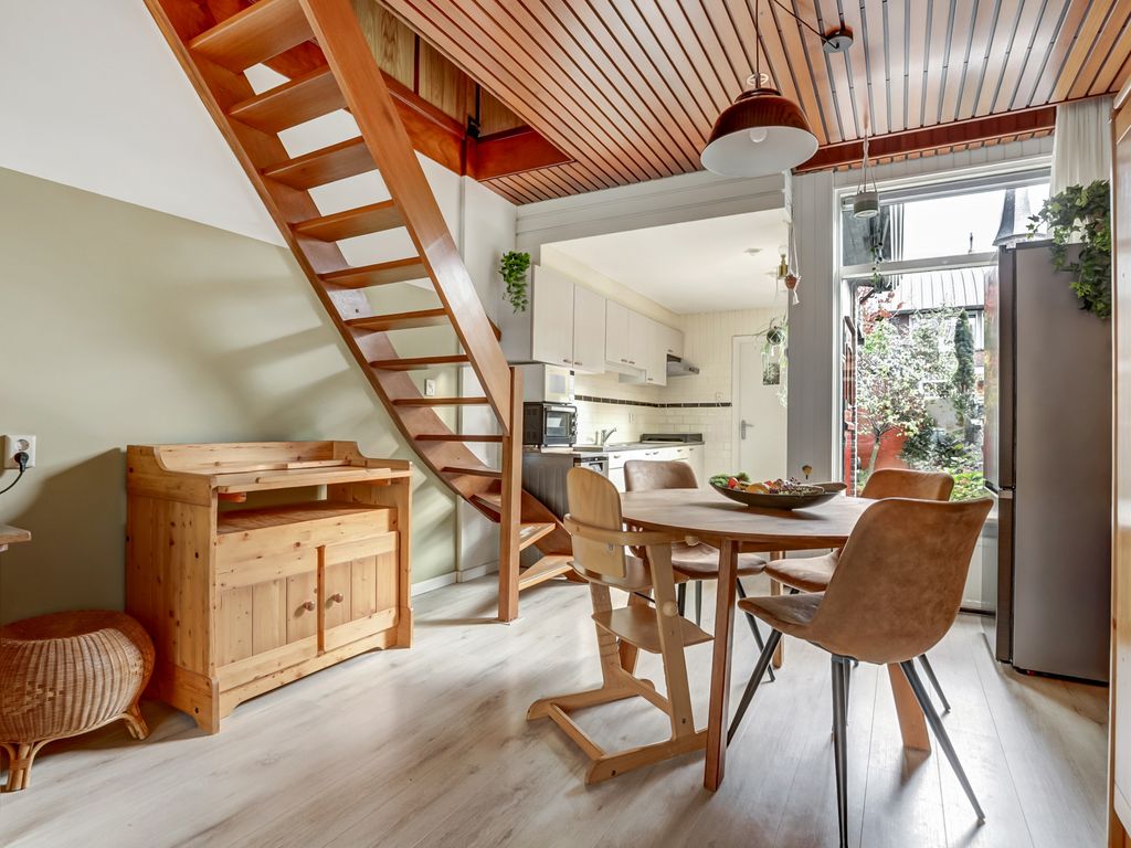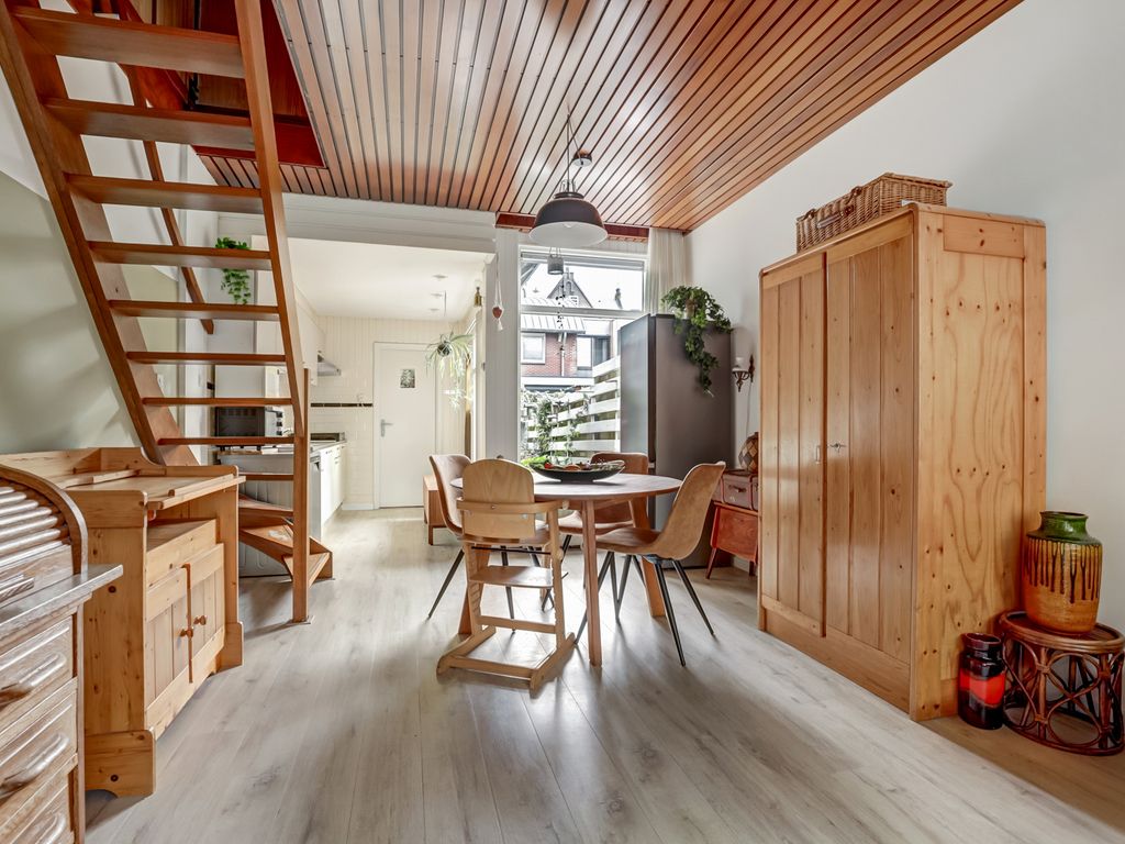 Achter de karakteristieke gevel met nieuwe voordeur (2024) bevindt zich de entree met meterkast (5 groepen) en ruimte voor garderobe. Via de hal loopt u de lichte woonkamer in, waar direct het hoge plafond met houten afwerking opvalt — een sfeervol detail dat de ruimte warmte en karakter geeft. De woonkamer biedt voldoende plek voor een zithoek en eethoek, en heeft een prettig zicht op zowel de straatzijde als de groene achtertuin. De gehele woonkamer is gestuukt en voorzien van een lichte vloerafwerking, wat het ruimtelijke gevoel versterkt.